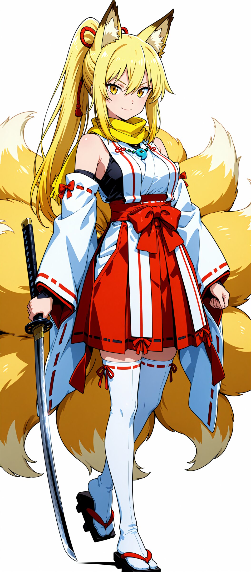 <lora:MeMax6-noob-vpred:1>,memaxl6_a,memaxl6_b,memaxl6_c,memaxl6_d,memaxl6_e, 10's anime style, Full HD, 32K, 1girl, full body, standing, (solo), (teenage):1.4, medium breasts, fox ears, fox tail, nine tails, mysterious, red bowtie, shiny hair, beautiful hair, shiny hair, (long hair, blonde hair, hair between eyes, high ponytail, ), yellow eyes, (tsurime:1.3), (japanese clothes, white miko, bare shoulders, clothing cutout:1.6), (red hakama short skirt, bike short, ), (black undershirt), white thighhighs, geta, (long yellow scarf:1.2), magatama necklace:1.2, looking at viewer, v-shaped eyebrows, smile, closed mouth, holding sword, katana, (simple background), (white background:2.5), masterpiece, best quality, super fine illustration, very aesthetic, newest, hyper detailed, intricate, beautiful, aesthetic, highly decorative, HDR, yume kawaii, ,anime screencap, anime, no gradients, 2D flat design, bold outlines,
