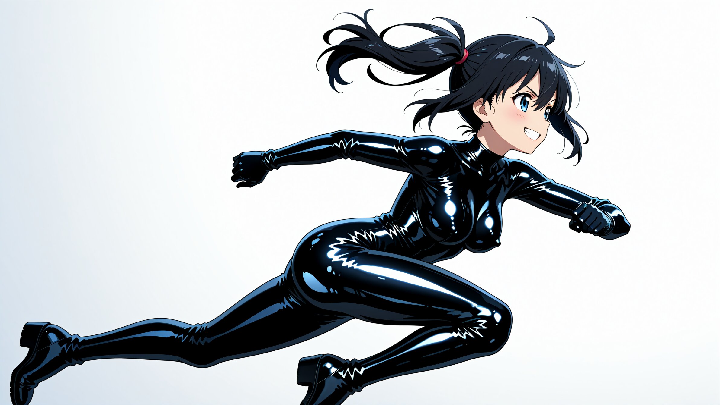 <lora:MeMax6-noob-vpred:1>,memaxl6_a,memaxl6_b,memaxl6_c,memaxl6_d,memaxl6_e, Full HD,32K, 1girl, (teenage):1.4, full body, running, from side, solo, smile, grin, looking ahead, v-shaped eyebrows, medium breasts, (teenage :1.3), (blue eyes), long hair, (long side ponytail):2.0, sideburns, hair between eyes, (((tareme))), (black hair), (beautiful hair), (shiny hair), (medium breasts), slender, blush, shiny clothes:1.8, ((((((black latex bodysuit:1.4)))))), ((black latex clothes:2.0)), (((skin tight))) ,(((tight clothes))), ((((seamless clothes)))):2.0, ((((((((shiny black latex bodysuit, shiny clothes, )))))))), ((black latex gloves)),((((no zippers)))), (covered nipples:1.6), erectile nipples, (simple background, white background), masterpiece, best quality, super fine illustration, very aesthetic, newest, hyper detailed, intricate, beautiful, aesthetic, highly decorative, HDR, yume kawaii, ,anime screencap,anime,no gradients, 2D flat design, bold outlines, 10's anime style,