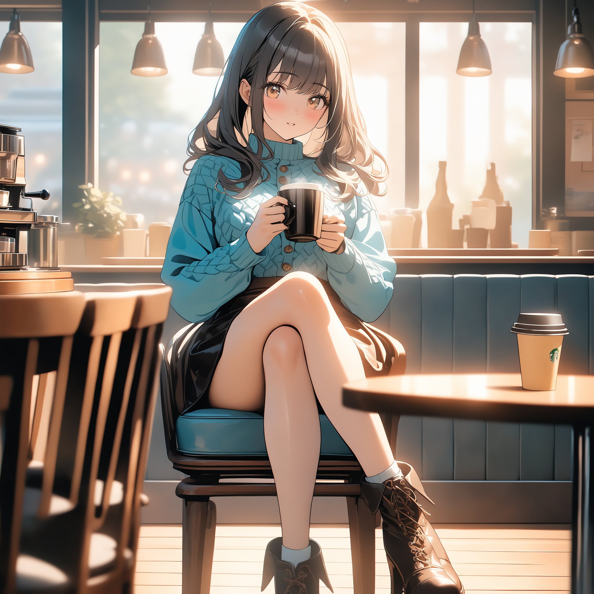 masterpiece, best quality, photorealistic, sharp focus, cinematic lighting, depth of field, beautiful composition, vibrant colors, ultra high res, 8K, highly detailed, masterpiece, best quality, very detailed, Full body shot, a cute girl sitting gracefully on a vintage wooden chair in a cozy cafe, legs crossed, holding a cup of coffee, soft indoor lighting, detailed interior background, warm atmosphere, intricate outfit details, 8k, vibrant yet soft colors.