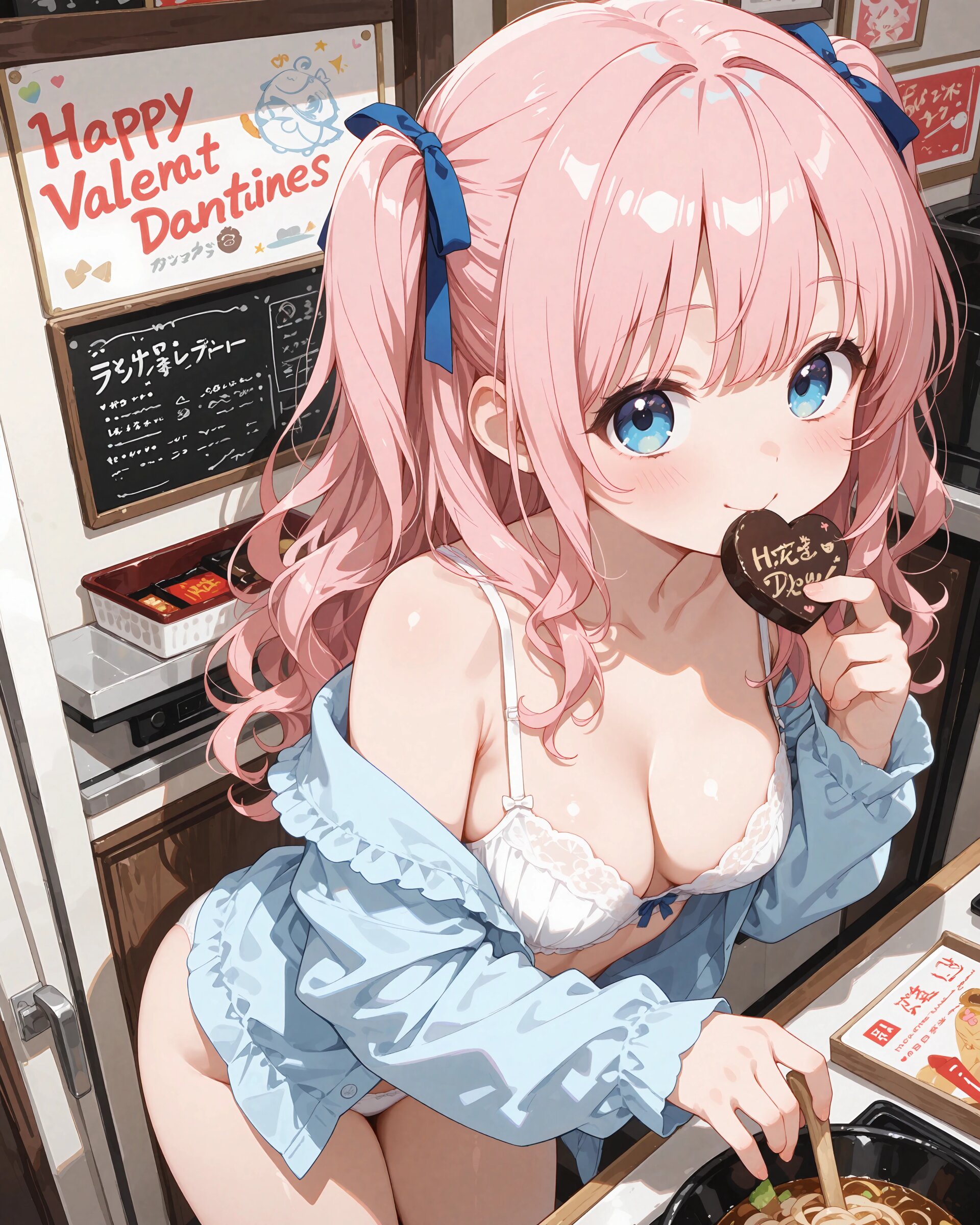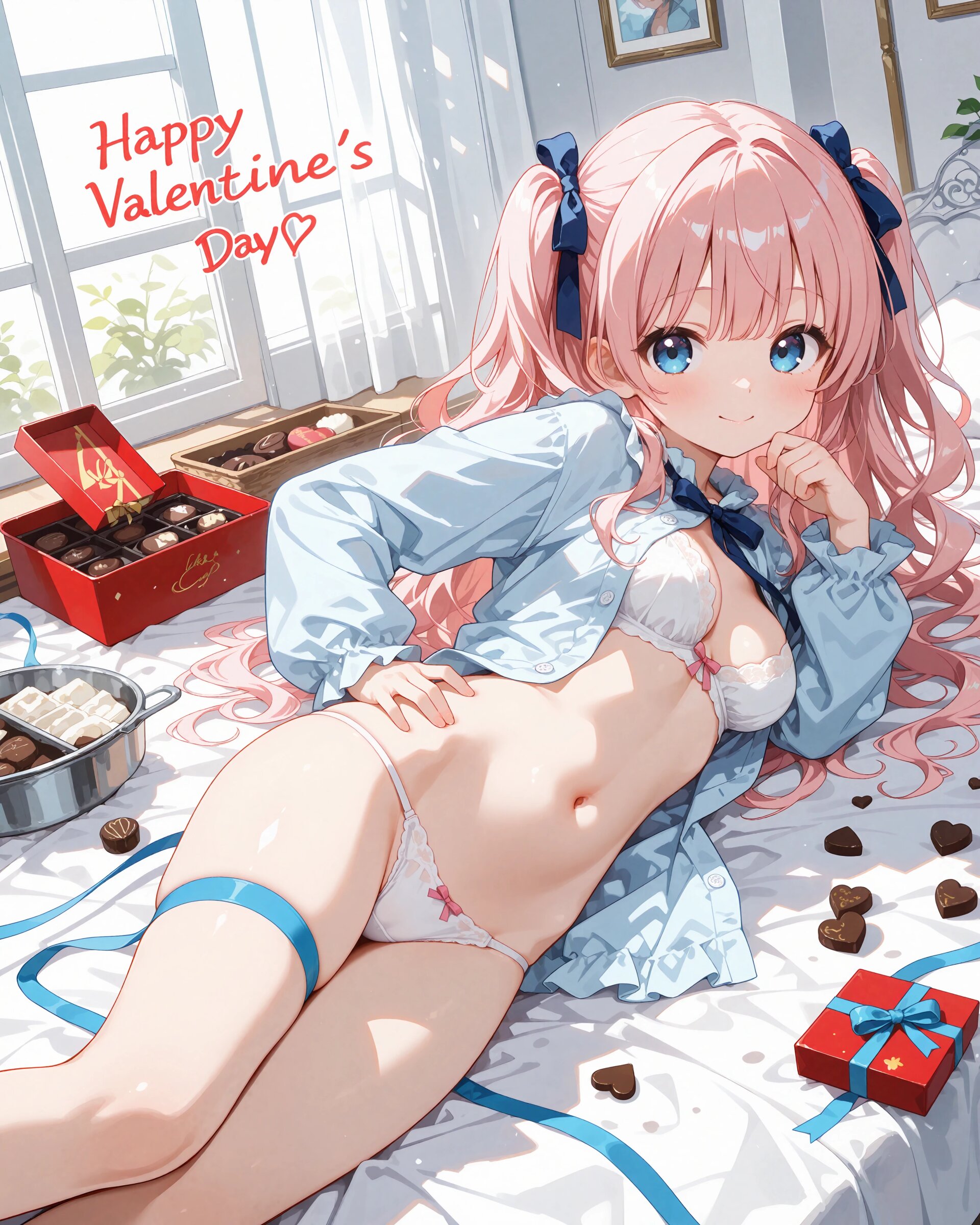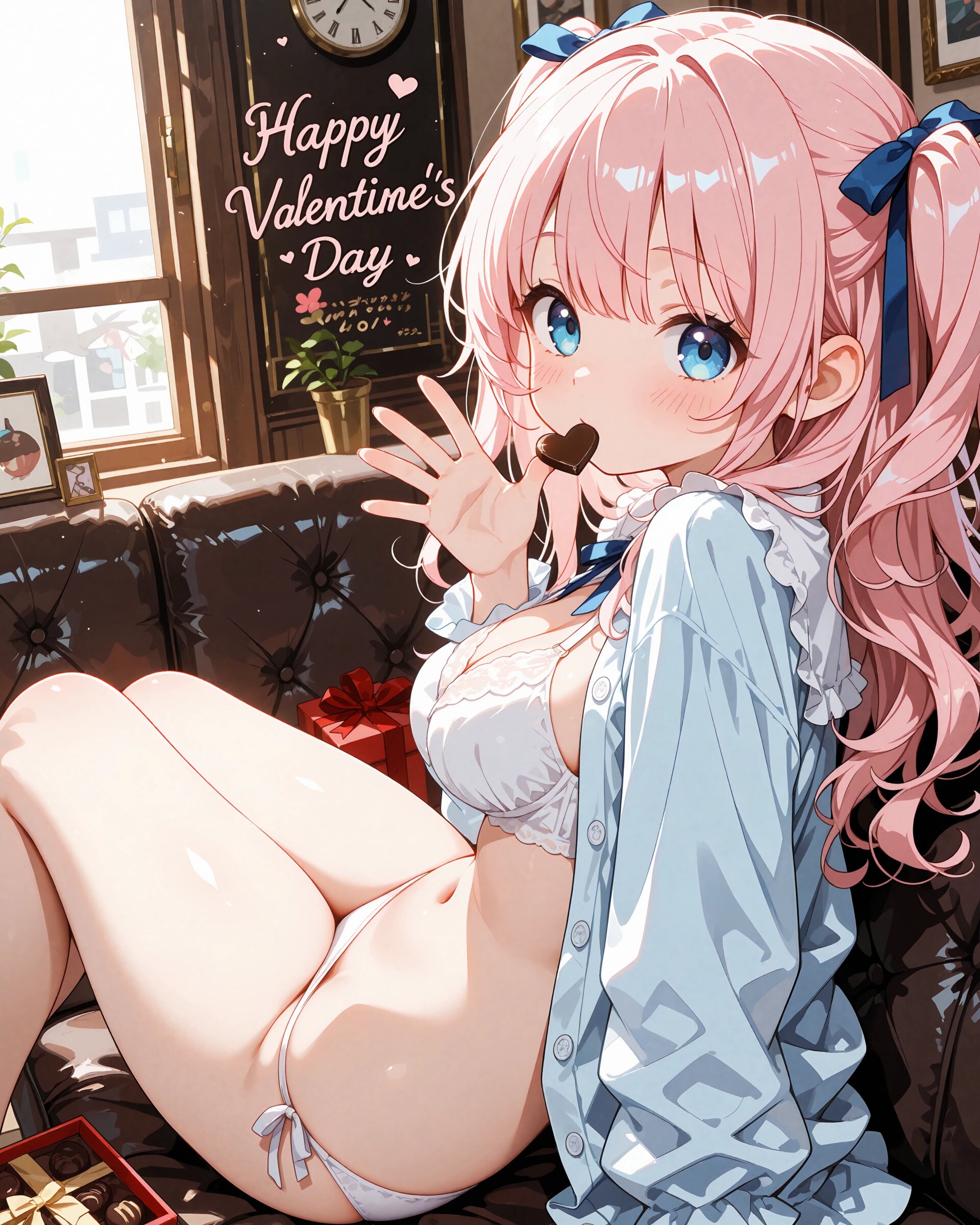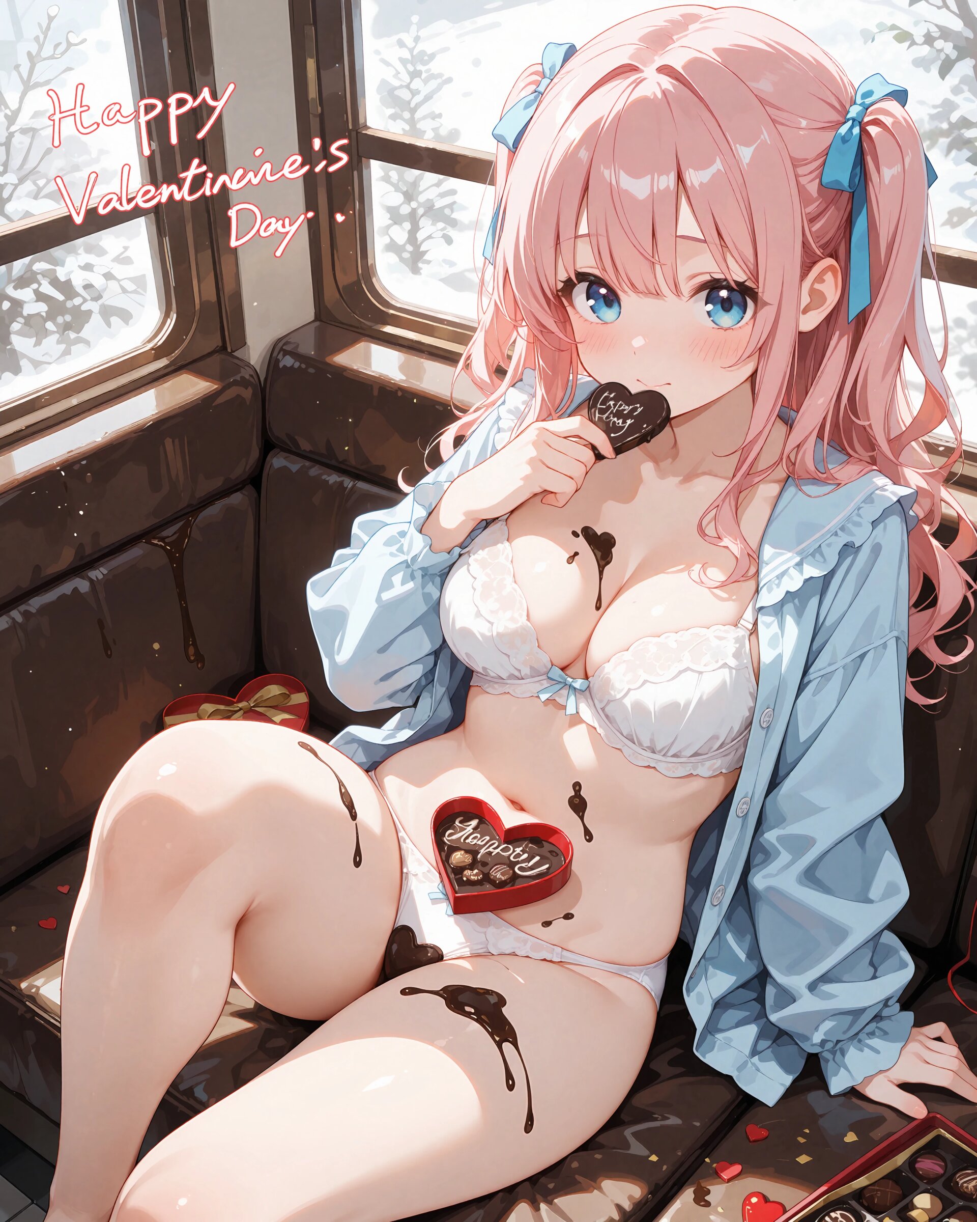1girl, solo, colorful, from above, feet out of frame, white bra, white panties, light blue blouse, long sleeves, open clothes, bottomless, Window Seat, (21 years old, cute girl, blue eyes, cute eyes, large eyes, blue ribbon, pink hair, long wavy hair, two side up, bangs, medium breasts), (thick thighs:0.8), blush, embarrassed, knee up, happy valentine, valentine, chocolate, clean lineart, delicate outline, clear silhouette, Masterpiece, Best quality, Amazing quality, Very aesthetic, Absurdres, Highres, Hi res, Newest