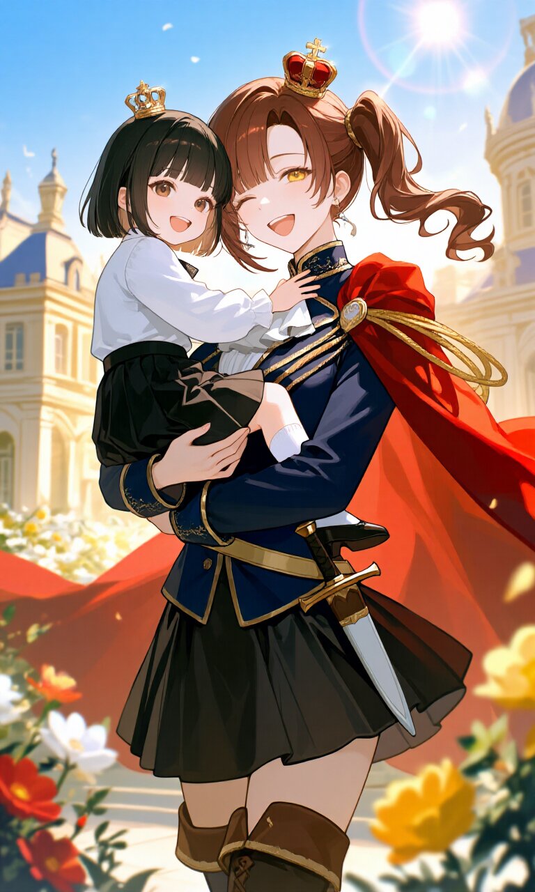 A heartwarming scene depicts a young 15-year-old mother with brown hair styled in a side ponytail and asymmetrical bangs, her yellow eyes squinting with joy as she laughs openly at the viewer. She wears a (Navy luxurious Prince costume:1.6) with long sleeves, a (luxurious Red Cape:1.3) flowing behind her, and a (luxurious Black mini skirt:1.4) paired with (luxurious Brown Boots:1.3). A (dagger on waist:1.3) and (luxurious crown on head:1.4) complete her princely attire. She is (holding a child:1.5), her daughter who has straight black hair with blunt bangs and big brown eyes, smiling adorably at her mother. The child wears a white luxurious prince costume with long sleeves, a black mini skirt, white socks, and a small crown. They stand outside a grand Palace with Rococo architecture, surrounded by flowers in the golden afternoon sunlight. The blue sky with shining lights and lens flare enhances the romantic academia atmosphere, creating a light and classic academic mood. Every detail from their delicate facial features to the intricate clothing textures is rendered with masterpiece quality, showcasing insanely detailed 16k resolution.