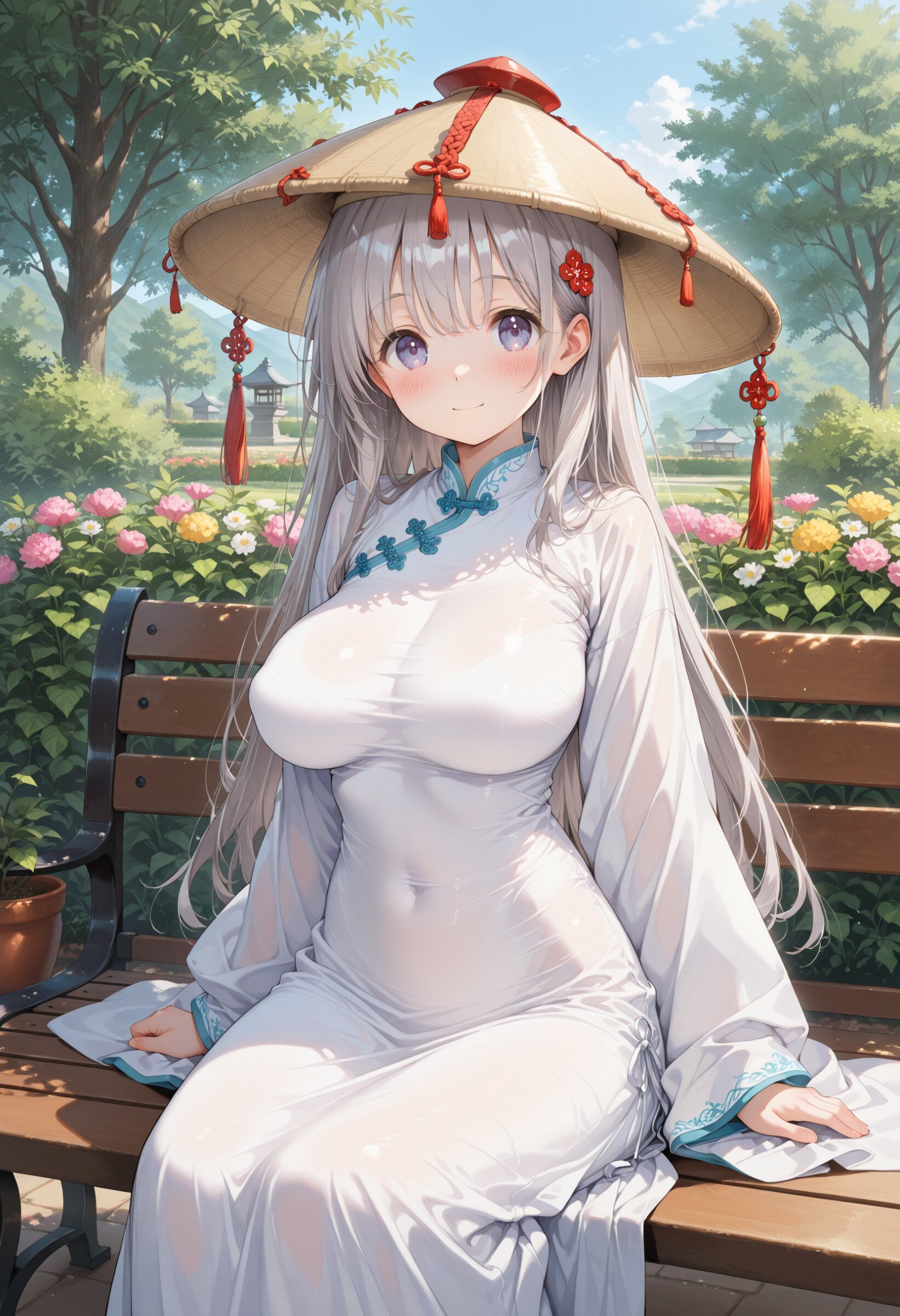 masterpiece, best quality, amazing quality, general, fine detail, official art, 1girl, loli, (petite:1.2) , student, beautiful black hair, long hair, beautiful eyes, (white vietnamese long dress:1.2), vietnamese Non La Conical hat, shaped waist, big breasts, impossible clothes, perky breasts, fully covered breasts, perfect fit, look at viewer, innocent expression, , in garden, cowboy shot, blush, sitting on bench, ,,look at viewer,