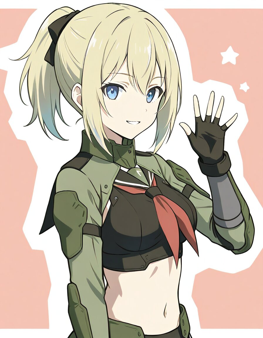 masterpiece, best quality, high quality, 1girl, solo, <lora:DollsNest_MyDoll_Ani4:0.7>, mydoll, single ponytail, blonde hair, bangs, medium breasts, blue eyes, serafuku, long sleeves, red neckerchief, midriff, navel, black gloves, fingerless gloves, parted lips, smile, waving, two-tone background, looking at viewer
