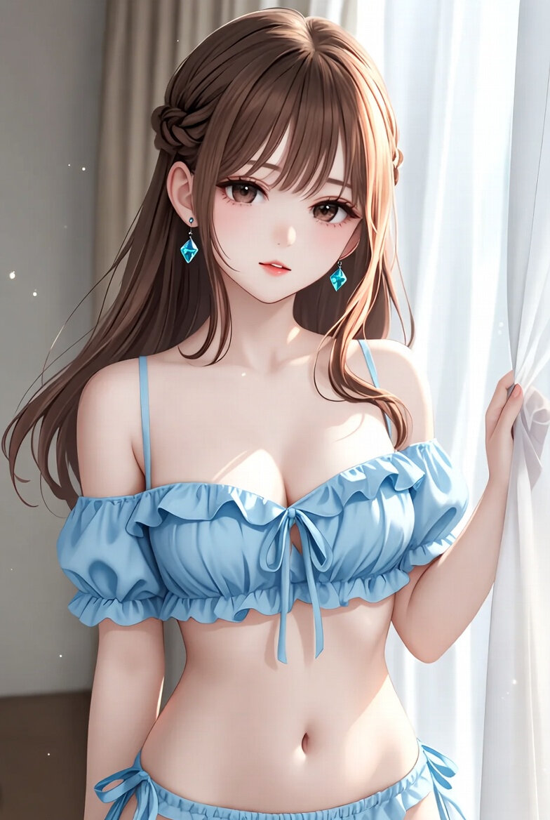 日本人女性22歳の写真。プロのカメラマンが撮影。 long brown hair in a side braid, blue crystal earrings, light blue off-shoulder crop top with ruffles and front bow tie, bare shoulders, bare midriff, slim waist, navel, light blue bloomer shorts with ruffles and side bows, standing indoors by a white curtain, soft morning sunlight filtering through window, subtle sparkles in air, detailed skin texture, smooth shading, high detail, masterpiece, best quality, intricate lighting, cute expression, slight pout, looking at viewer