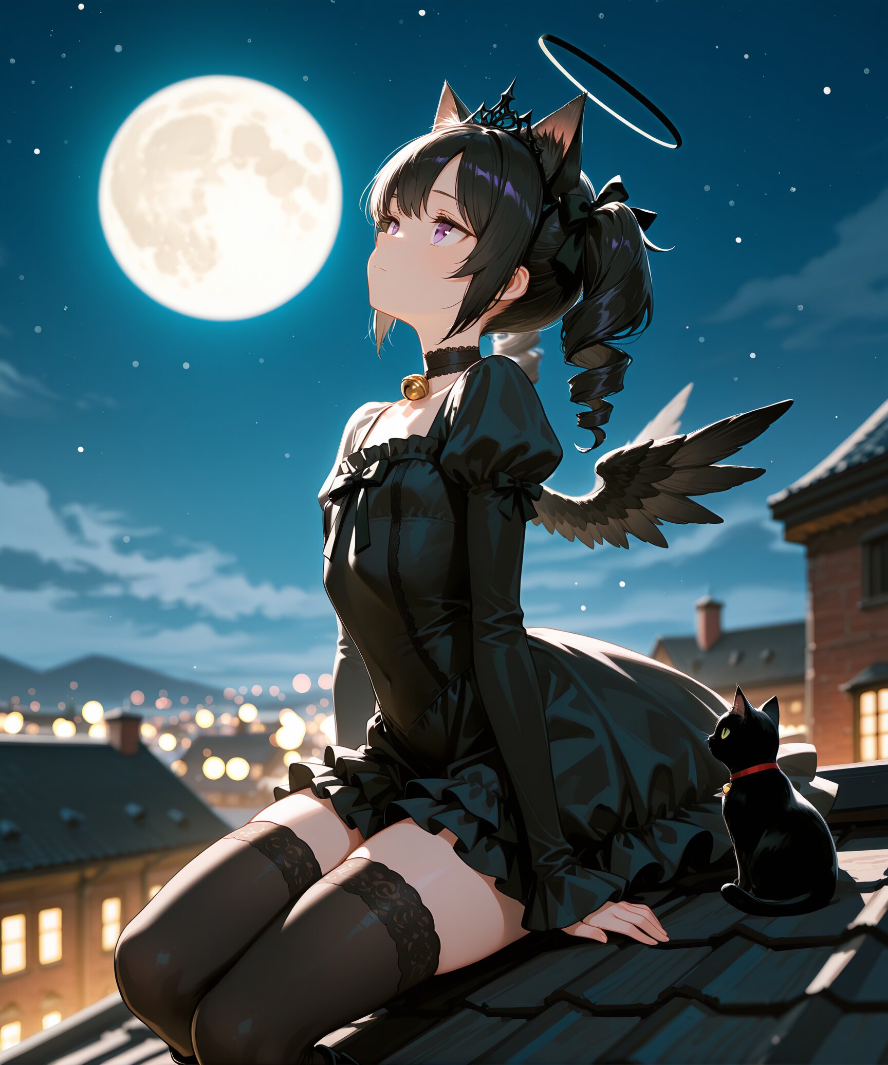 masterpiece, best quality, absurdres, 8k, ultra detailed, aesthetic, very aesthetic, newest, <lora:Fixhands_anime_bdsqlsz_V1:0.5>, <lora:bold-16oa:-0.5>, (realistic:0.3),BREAK (shallow depth of field,Gaussian Blur:1.2),1girl,(masterpiece, best quality, ultra-detailed:1.3), sitting on rooftop, rooftop at night,full moon, moonlight, night sky, stars,old european rooftops, chimney, tiles,black cat motif, elegant pose, soft smile,fantasy lighting, moonlight illumination,sparkles, soft glow,anime style, detailed, high quality,black twin drill hair, purple eyes, jitome,expressionless,(tiara, black wings folded behind,jitome:1.1),black halo,small breasts,cat ears,closed mouth, (cowboy shot:1.1),(flat chest,curvy:1.3),(black hair:1.5),skul accessories,black gothic lolita, gothic dress, frilled dress, lace trim,black ribbon, choker with bell, long sleeves,looking up,side view,thighhighs, boots,<lora:USNR STYLE_XL_loha:0.8>