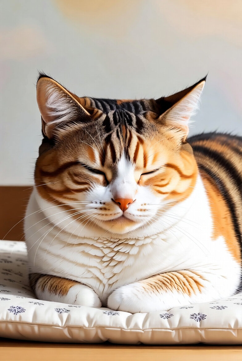 猫のイラスト。キジトラ柄。座布団の上で眠っている。