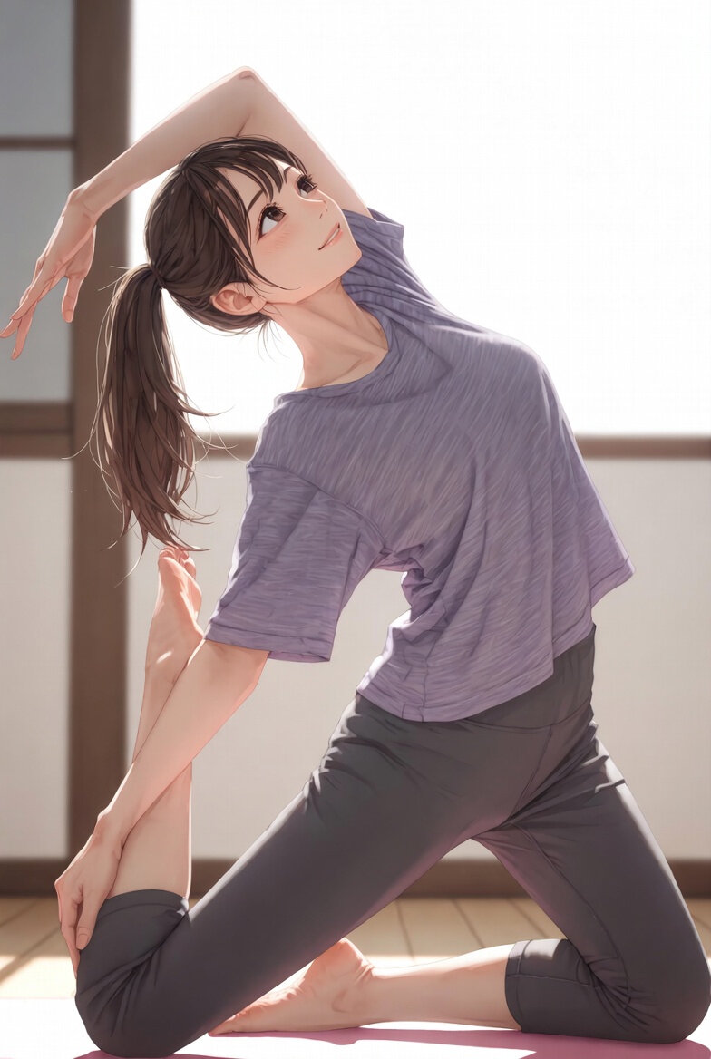 日本人女性24歳のデジタルイラスト。ポニーテール、優しい笑顔、穏やかな表情、ヨガの三角のポーズ(Utthita Trikonasana / Extended Triangle Pose)、右側に体を倒したバージョン、右手で左足首を掴む、左手は天井に向かって真っ直ぐ伸ばす、視線は上に向ける、室内の明るいナチュラル光、シンプルで清潔な和風モダンな部屋、木の床、薄いピンクのヨガマット、ゆったりしたゆったりした麻調の薄紫ピンクのオーバーサイズTシャツ、ダークグレーの7分丈レギンス、素足、ナチュラルメイク、リラックスした雰囲気、高解像度、柔らかい自然光、詳細な肌の質感。