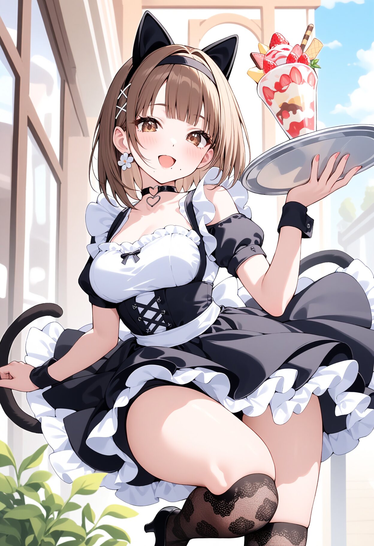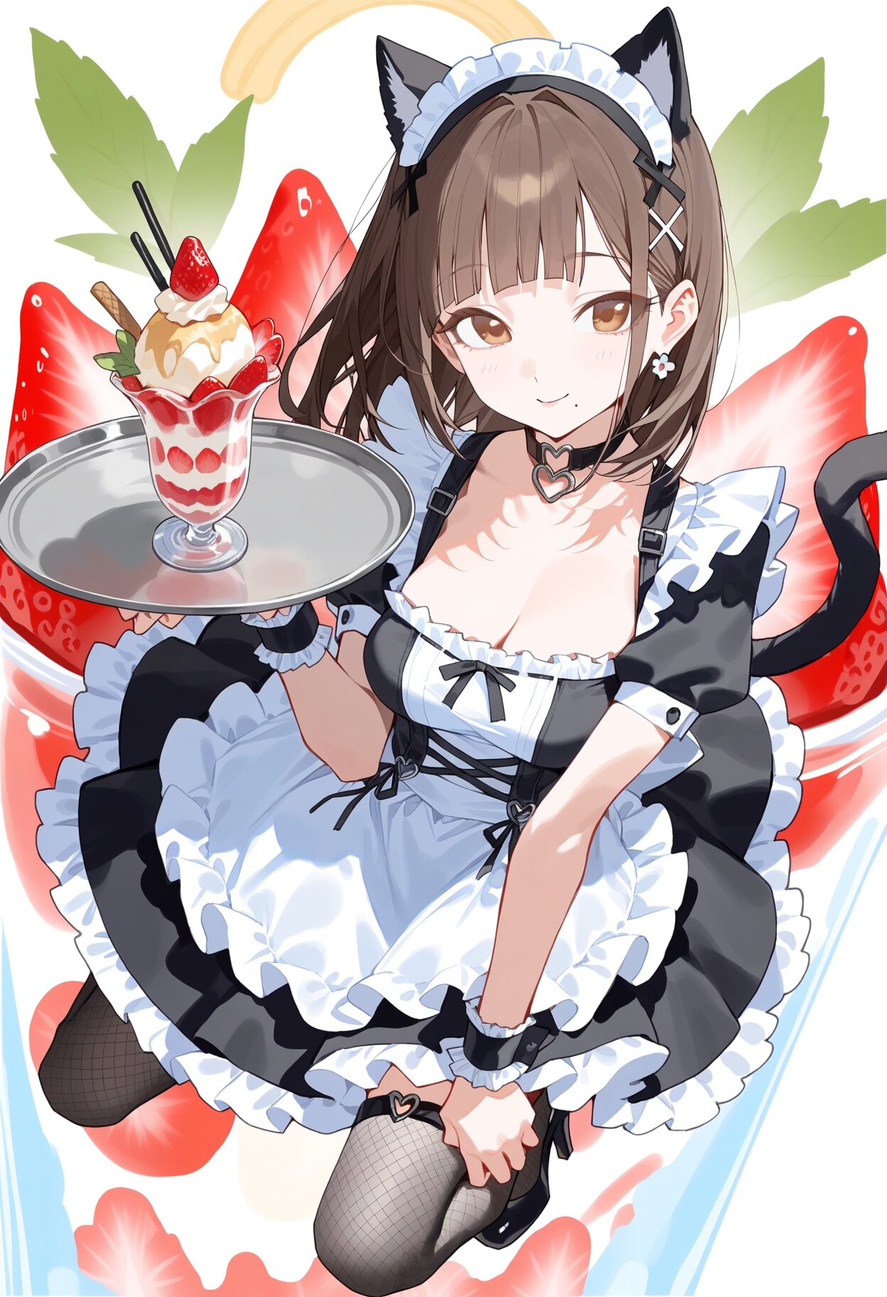 Anime-style illustration, black cat-ear headband and black cat tail, elegant off-shoulder maid dress with a lightly fluttering skirt, black lace over-the-knee socks and black high heels; energetic and cheerful vibe; dynamic pose with a bright smile, medium-close framing with a slight high angle; girl holding a silver tray with a cream-topped strawberry parfait; sunny daytime café background, strong depth of field.