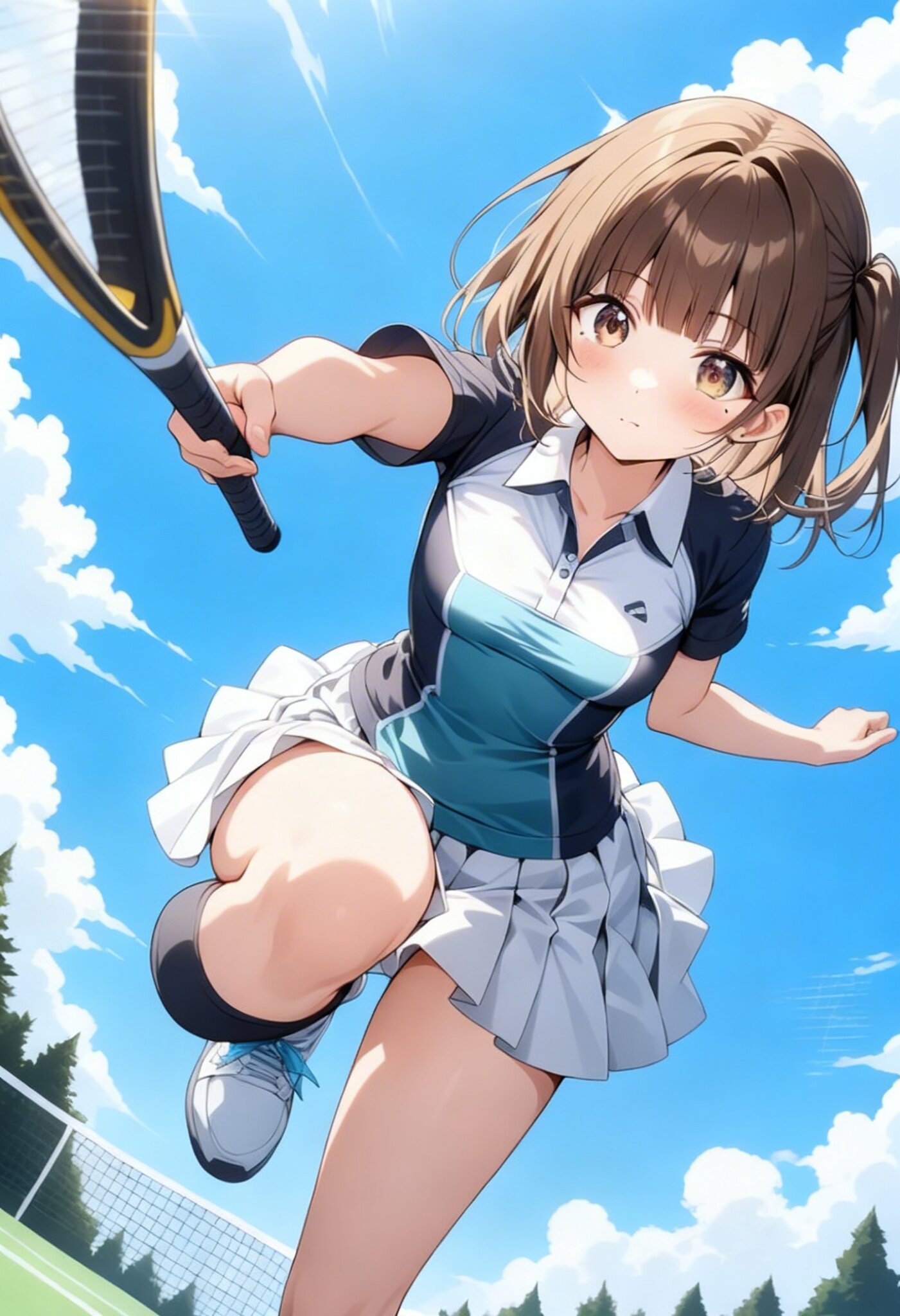 Extreme low-angle view, anime style, dramatic perspective with the front leg and shoes exaggerated in the foreground, dynamic jump serve at the peak of motion, body fully extended upward with one arm powerfully swinging the tennis racket, the other arm raised after the toss, pleated tennis skirt fluttering intensely, fitted short-sleeve tennis shirt, over-the-knee socks emphasizing a clear thigh gap (zettai ryouiki), outdoor tennis court under a bright blue sky.