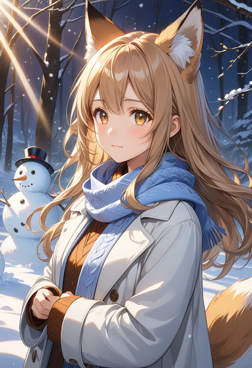(high resolusion,illustration,ultra detailed 8k art,extremely detailed CG,official art,clothes reflecting light,detailed shiny skin,detailed background:1.3), ((highly detailed beautiful face and eyes),anime_style, fox_ears, girl, light_brown_hair, double_eyelids, long_eyelashes, fluffy_tail, long_coat, scarf, long_boots, snow, snowman, soft_winter_lighting, expressive_eyes, delicate_features, serene_atmosphere, natural_pose