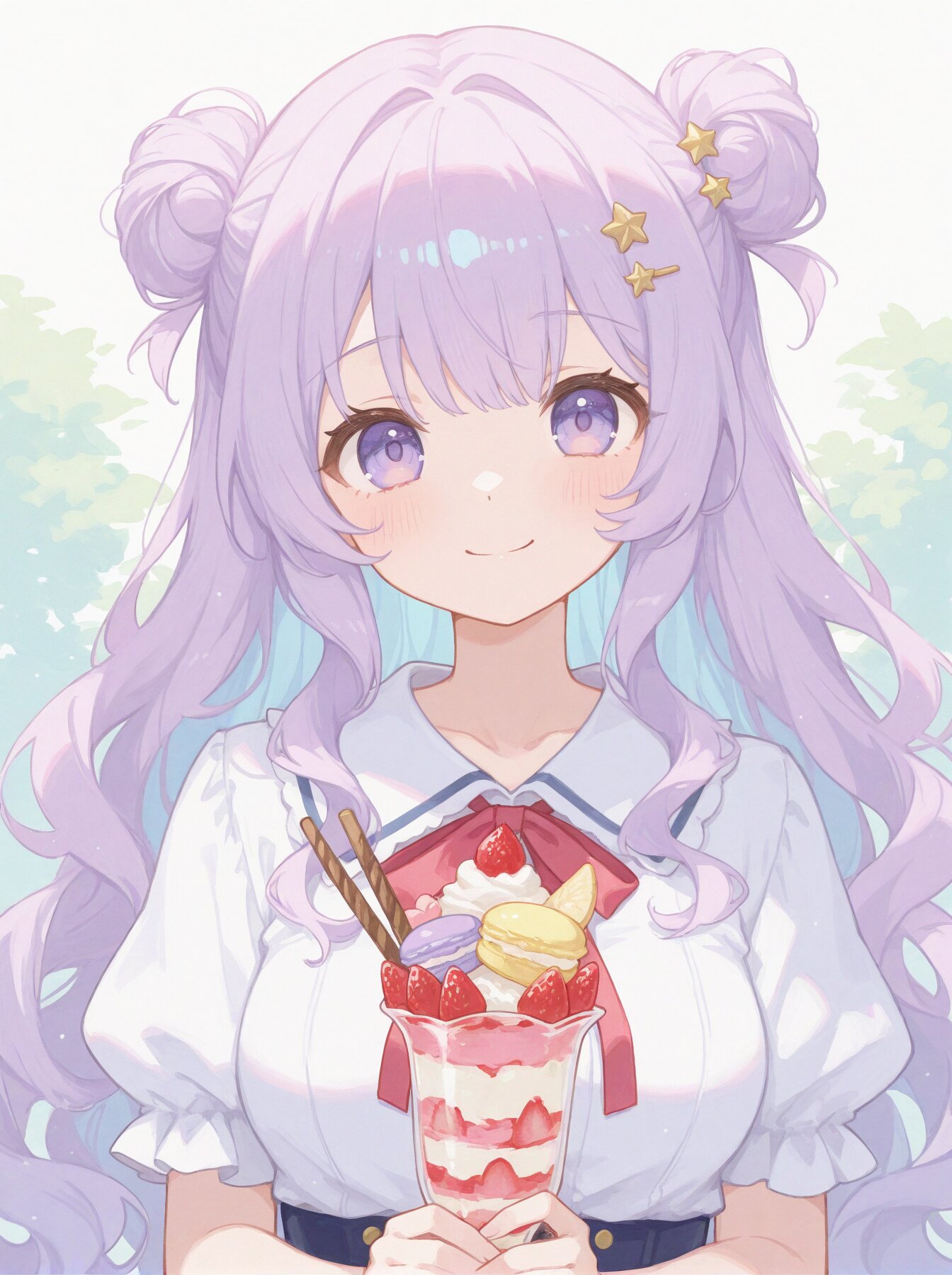 soft focus, masterpiece, best quality, amazing quality, solo, kawaii, 1girl, (upper body:1.4), (close-up:1.3), soft anime face, teenage, (medium breasts:1.2), pastel purple hair, (light blue inner hair:1.3), (loosely wavy hair:1.4), (fluffy long hair:1.3), [Hair A (Buns)] two side buns, star-shaped hairpin, (bright purple eyes:1.4), (happy gentle smile:1.2), (looking at viewer:1.2), (tilting head slightly:1.3), wearing a white short-sleeved blouse with red neck ribbon, (holding a large pastel-colored parfait with macarons:1.4), (soft pastel color palette:1.5), (pastel tones:1.4), (light and airy atmosphere:1.3), soft indoor food court background in pastel colors, bright daytime lighting, watercolor texture, matte finish, (watercolor style:1.6),, (soft pastel color palette:1.5), (pale colors:1.3), watercolor texture, matte finish, subtle shading, minimal contrast,