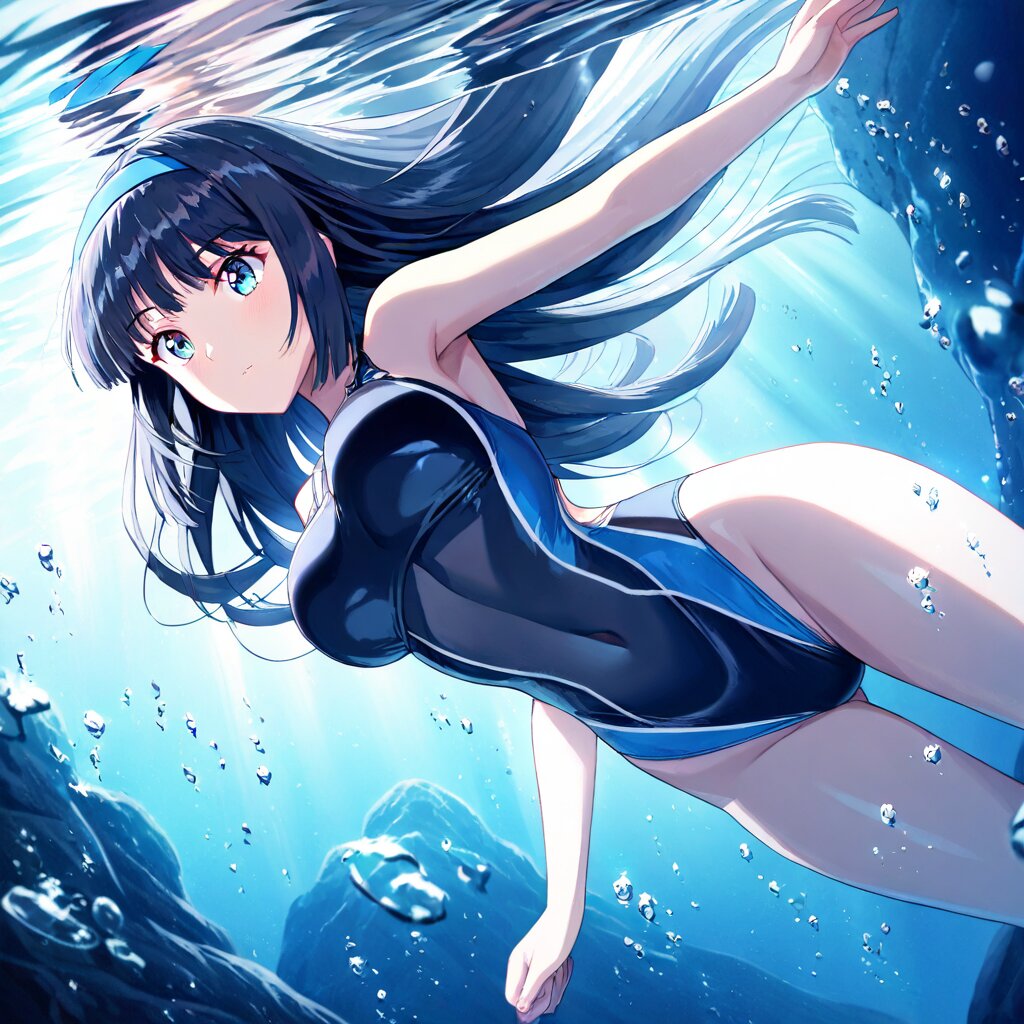((masterpiece)), ((best quality)), (ultra-detailed), anime style,cowboy shot, dark cave,underwater, submerged,a cute girl, 1girl, large bust ,(Black Racing-style swimsuit), beautiful black hair,(diving underwater),swimming, ((beautiful eyes)),straight hair, (blunt hair), ((blue hairband))