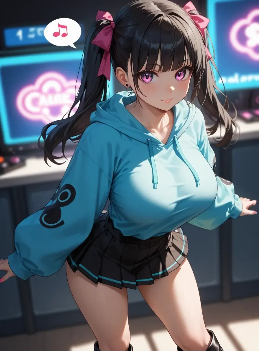 ((Slightly high angle, close up on the girl)),blurry background,spoken musical note,:d,bent_over,Oversized gray long-sleeve hoodie with dropped shoulders and voluminous sleeves, high-waisted black mini skirt with a smooth, wrinkle-free and pleatless design, slim black knee-high boots with a slight platform heel, subtle sweet feminine accents with delicate ribbon details, oversized top and compact bottom silhouette, inside a brightly lit arcade with colorful game machines and neon lights in the background.Masterpiece, Ultra HD, Cinematic lighting, High definition, Depth of field, (Blurred background), (Dramatic lighting), Top quality, Very beautiful, 8K, Simple background,1girl,loli,bishoujo,black hair,twintails,big breasts,narrow_waist,tsurime,early teen,