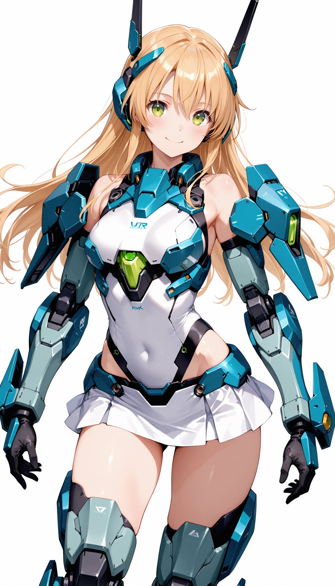 1girl, ((white background)), ultra detailed 8k cg render, masterpiece, high resolution, extremely detailed, mecha musume,mecha shoulder, mech leg, headgear, mecha armor, ((mini skirt)),long blonde hair, dropping green eyes, smile, dynamic posing,