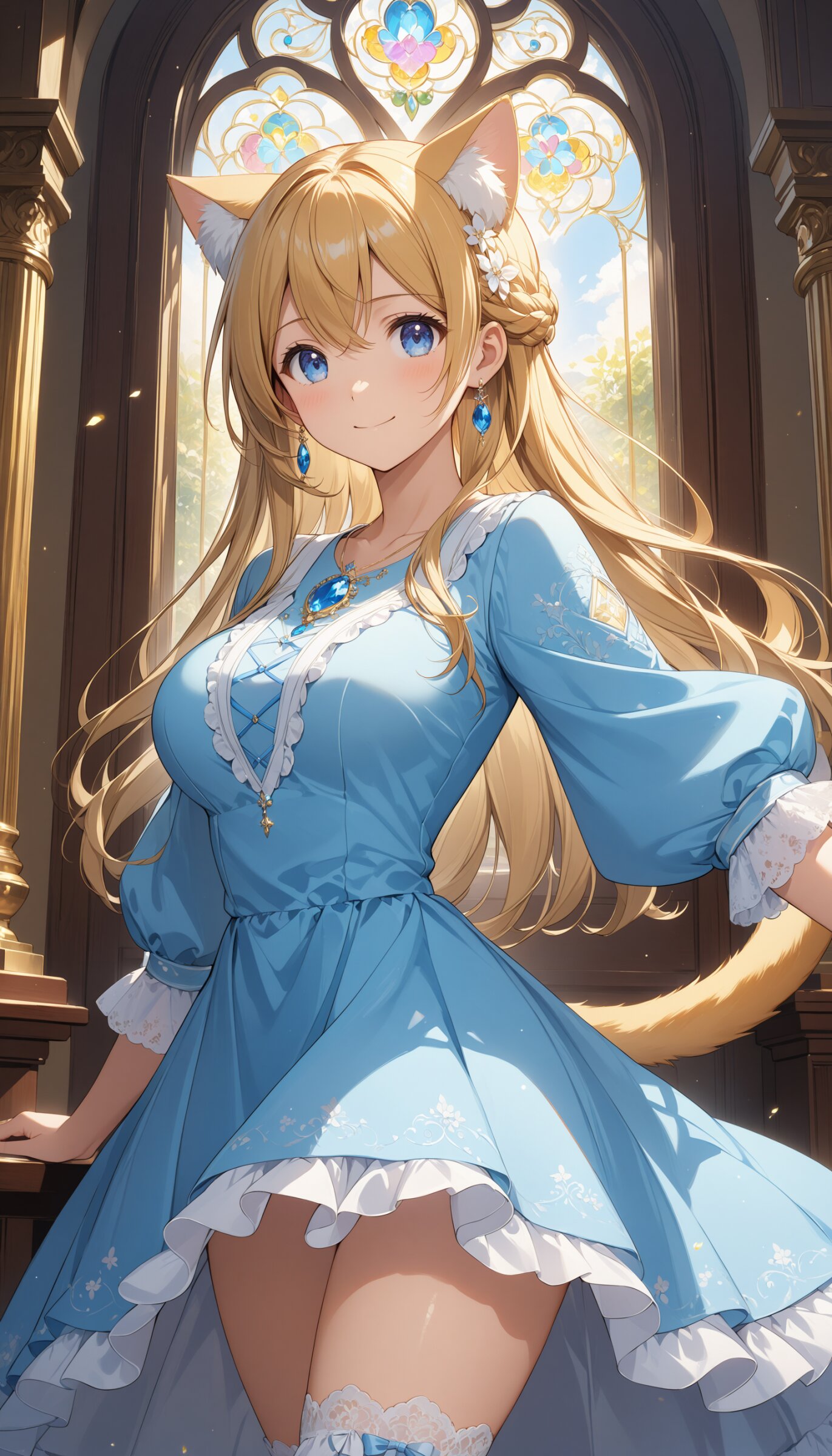 (masterpiece,high resolusion,illustration,ultra detailed 8k art,extremely detailed CG,official art,clothes reflecting light,detailed shiny skin,detailed background:1.3), ((highly detailed beautiful face and eyes)) BREAK 1girl, cowboy_shot, 16-year-old, kawaii, cute_face, tareme, inocent_smile, no_makeup, beautiful_anime_girl, blonde_cat_ear, blonde_hair, long_hair, straight_hair, large_breasts, beautiful_breasts, blonde_cat_tail BREAK luxurious_necklace_and_Earrings, light_blue_dress, puffy_long_sleeves, Lace_cuffs, miniskirt, frilled_skirt, white_lace_ankle_socks, blue_high_heels BREAK palace, arched_window, standing,