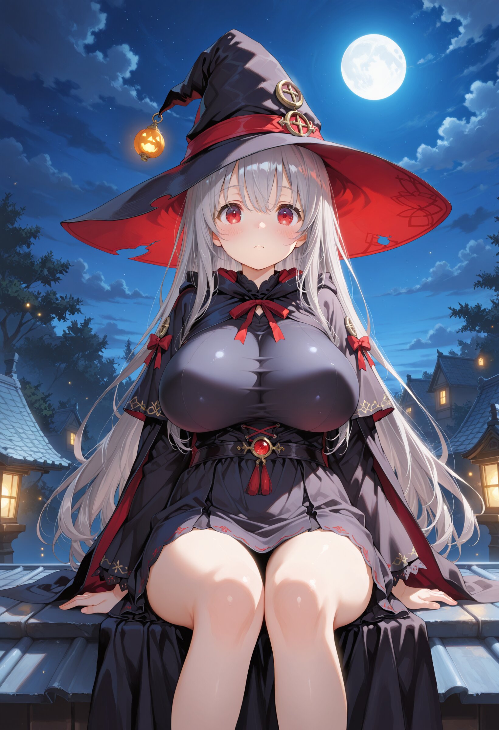 masterpiece, best quality, amazing quality, general, fine detail, official art, 1girl, loli, petite, witch, beautiful orange hair, beautiful orange eyes, beautiful legs, big breasts, impossible clothes, perky breasts, grin, Holding a broom, night, moonlight, stand on the roof,