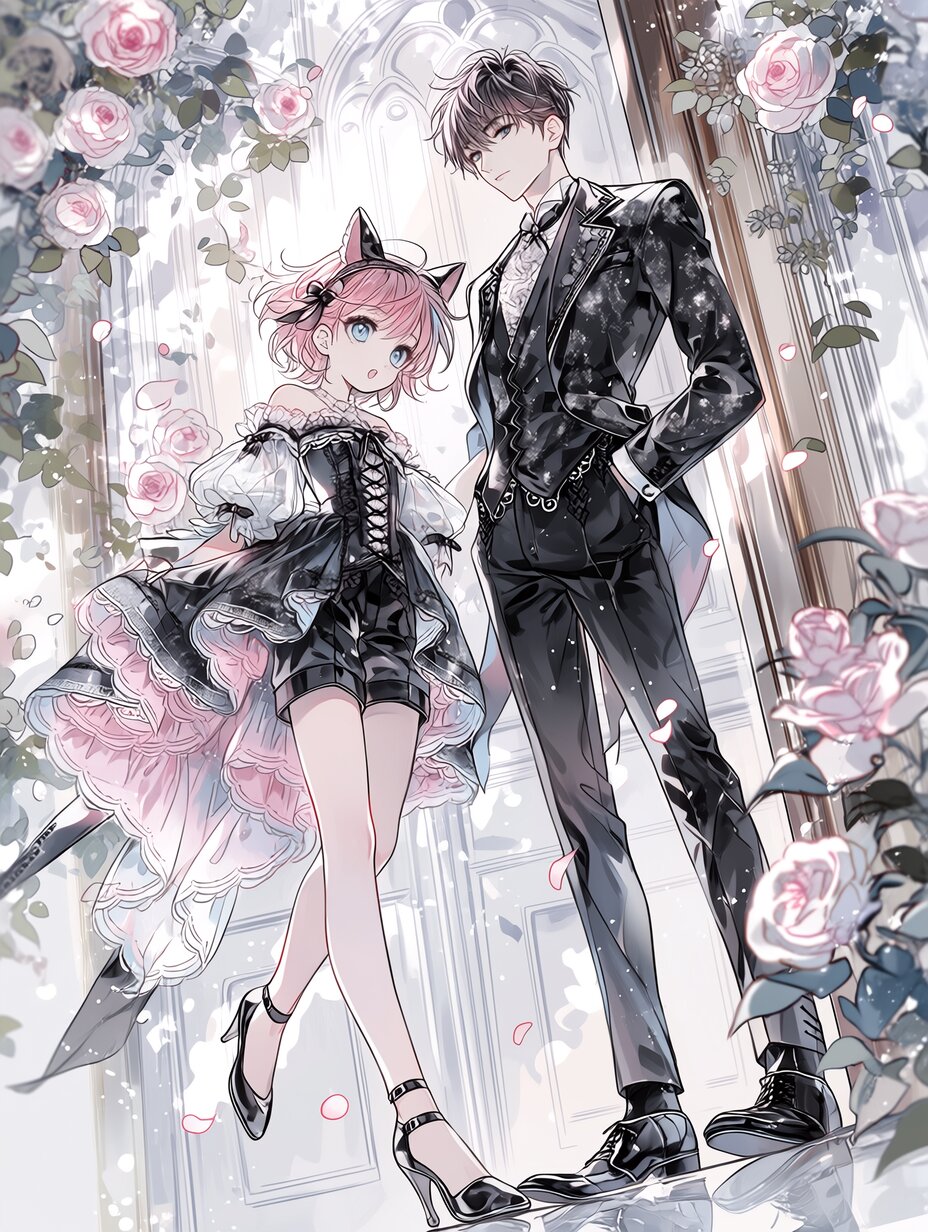 a boy and a tall handsome boyfriend. Boy: (masterpiece, highest quality, high resolution, 8k wallpaper: 1.2), very fine (super detailed eyes, sparkling eyes: 1.1), (soft glossy skin), cute young boy, soft fluffy pink hair, cat ears, short hair, prominent clear blue eyes; long eyelashes; delicate features; gentle innocent expression with graceful signs, Wearing an elaborate Gothic lollita dress, black Gothic offshoulder design, white lace foundation, delicate pink tulle and layered frills, a puff sleeve that falls softly from the shoulder, a ribbon in the middle of the chest, corset-like details, black shorts, and a mini-length skirt with a dramatic long flareback, romantic silhouette, sophisticated fantastic lollita fashion, high heels with thin straps, black short gothic boots, slender legs highlighted (cinematic lighting), soft diffuse light, shining pink highlights, edge lighting, flowerlike dreamy ethereal atmosphere, beautiful shining skin , dynamic pose , graceful movement , slightly twisted body , Dynamic angles, three-thirds laws, depth of view, beholders, romantic Gothic flower gardens, partial view of wooden doors and pale walls, Gothic flowers and roses, soft fog around him, floating petals and blurred backgrounds and a blurring elegant fantasy atmosphere. It's magical, fairytale-like, and overwhelming cuteness, Visible richness, neatness, breathtakingly handsome young Japanese man, dark hair with a few streaks on his forehead, pale brown eyes, quiet, melancholy glow, long eyelashes, sophisticated features and elegant jawline and smooth pale skin and perfectly balanced proportion, Clean and sharp line art. Beautifully tailored black suits, subtle luster, slim silhouette, matching black tie, crisp white dress shirt, ultra-detailed fabric texture, realistic pleats, black slacks and high-quality leather shoes for neat and sophisticated styling. low angle