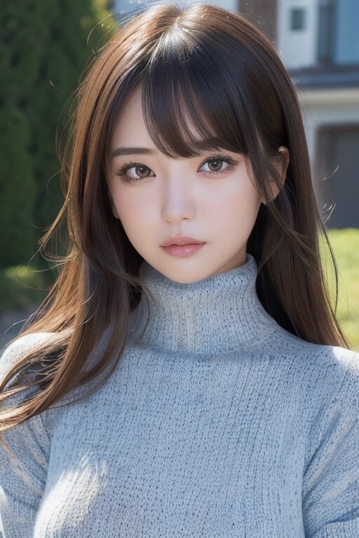 masterpiece, hyper detailed, 8K, hyper detailed illustration, Japanese woman, 23yo, cute, pretty, hyper detailed face, hyper detailed eye, beautiful eye, medium hair,bangs, thin, tall,170cm tall, ((turtleneck long sweater,Hand-knitted Sweater:1.2)),cleavage cutout, sleeve long sweater,thigh, hyper detailed,
