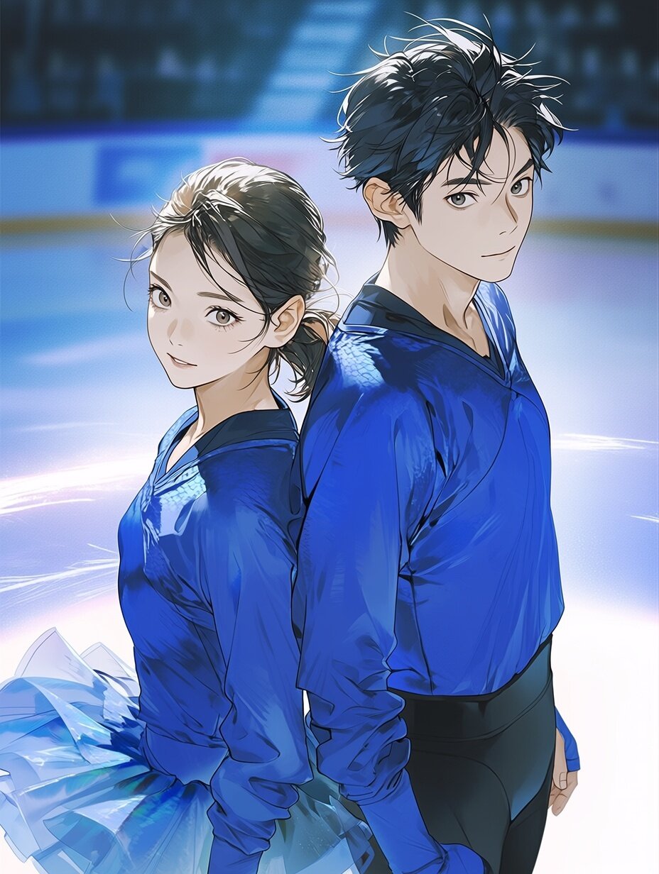 Portrait of a Japanese pair skater on ice. The female skater wears her hair pulled back, softly framing her face. She is dressed in a blue jersey with a frilly organza skirt underneath. The male skater appears to be in his late twenties to early thirties, with short-cropped black hair and sharply defined facial features. He wears athletic wear consisting of a blue jersey and black pants. The pair stand close together, their gazes slightly averted. Blurred spectator seats are visible in the background. Ice reflections lend a cool overall tone, captured in high resolution. Portrait photography, soft lighting, focus on the subjects, Anime style