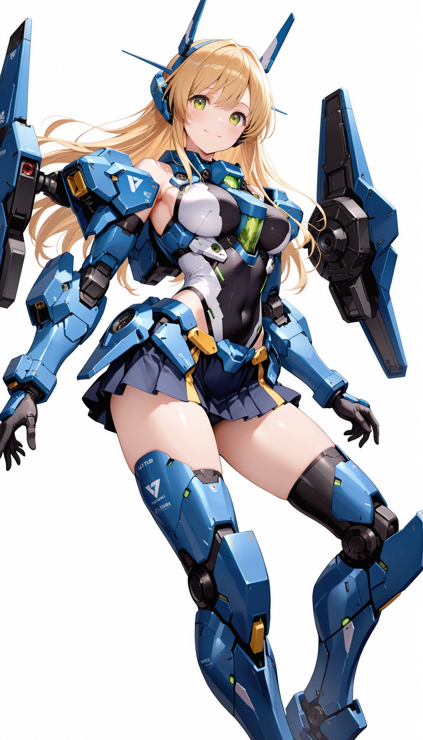 1girl, ((white background)), ultra detailed 8k cg render, masterpiece, high resolution, extremely detailed, mecha musume,mecha shoulder, mech leg, headgear, mecha armor, ((mini skirt)),long blonde hair, dropping green eyes, smile, dynamic posing,