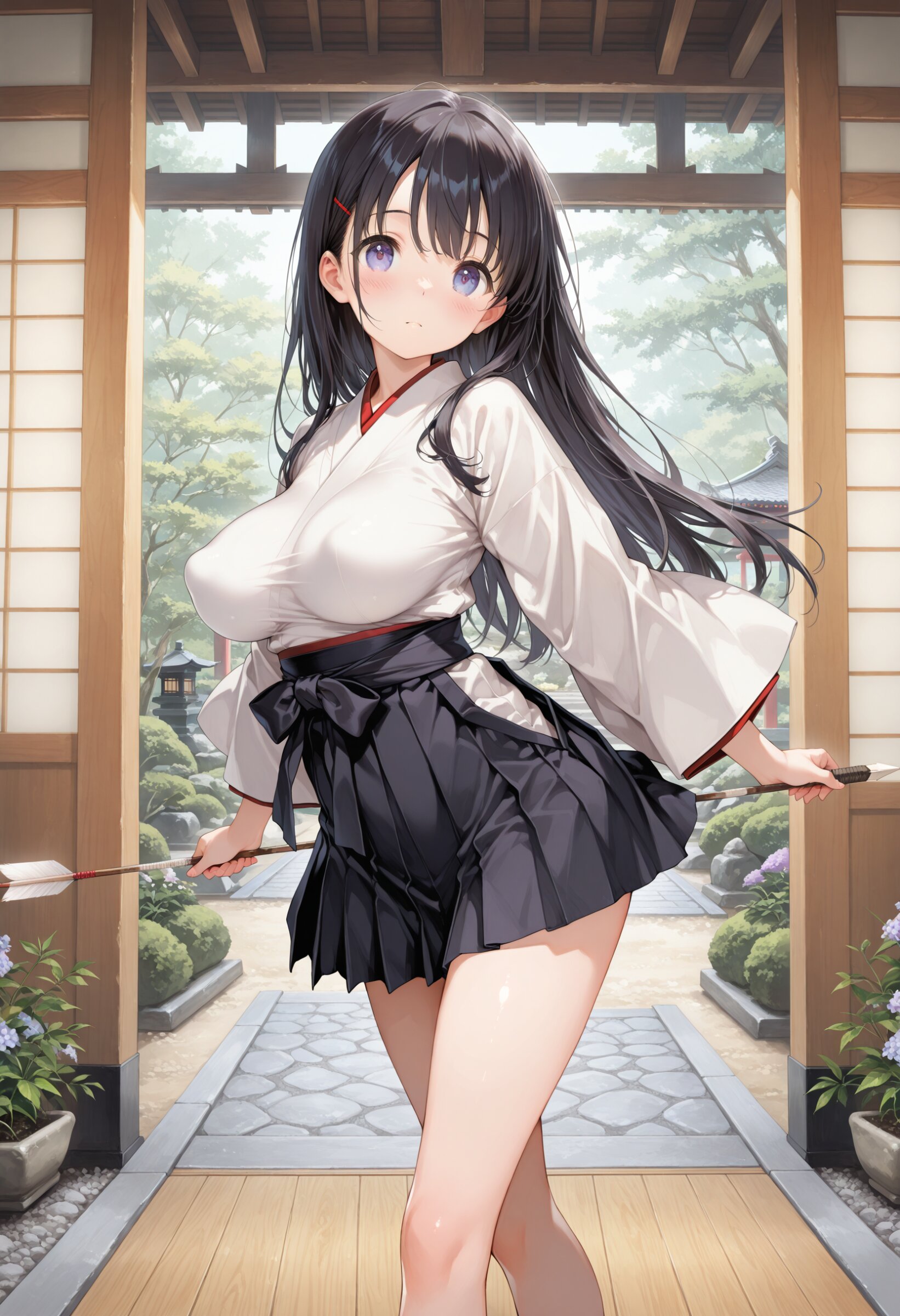 masterpiece, best quality, amazing quality, general, fine detail, official art, 1girl, loli, petite, beautiful black hair, beautiful eyes, black hakama, miniskirt, beautiful legs, big breasts, impossible clothes, (perky breasts:1.2), innocent expression, in japanese garden, (Aim with a wooden arrow:1.2), dynamic pose, ,
