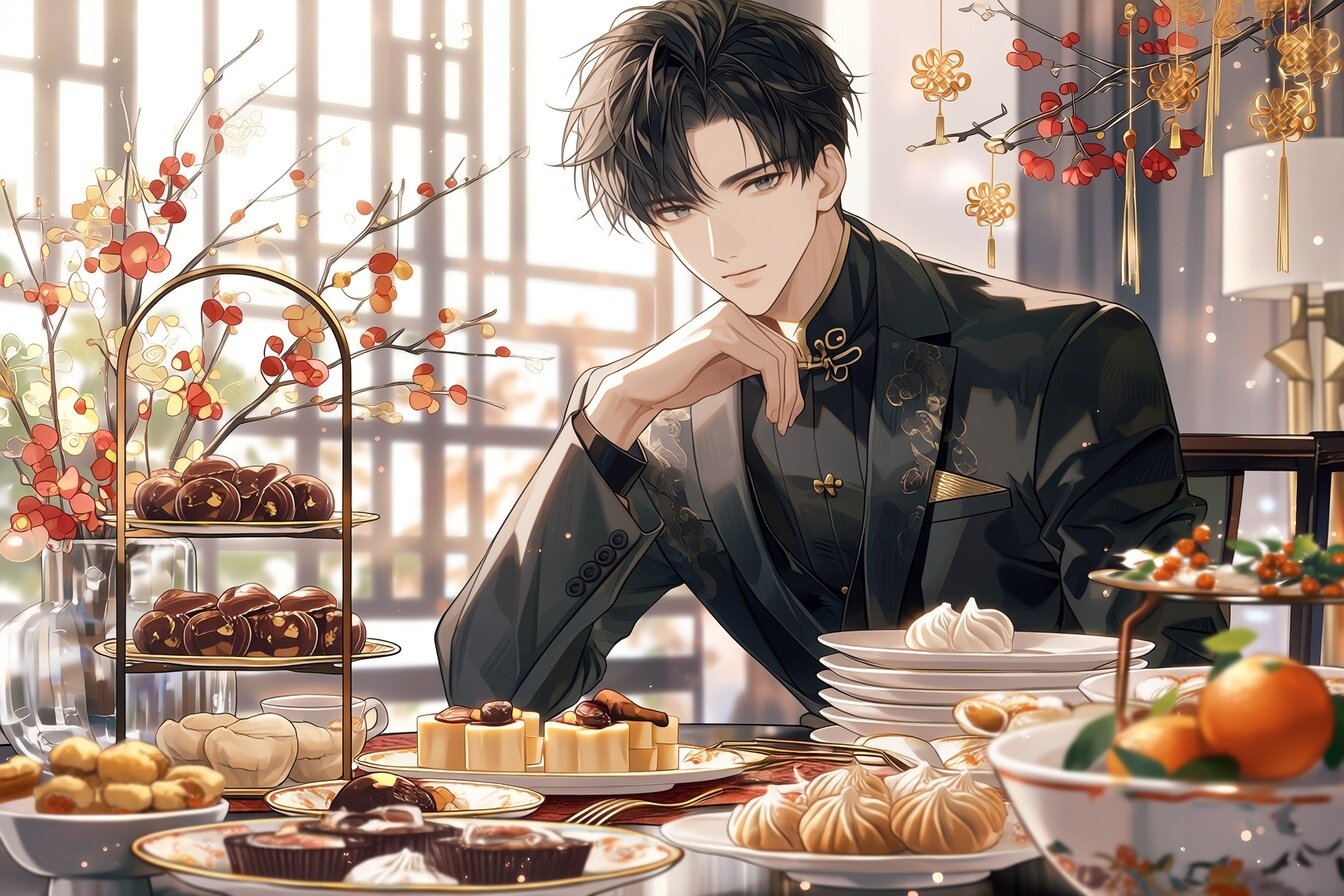 Full-body shot of a delicate, elegant Chinese man with short, soft black hair and pale skin, his contemplative, peaceful gaze fixed. Seated at a traditional New Year's dining setting featuring lacquered tableware, golden Wonho Chocolate, dumplings, tangerines, New Year's cake, Baoz, and pineapple tarts. Warm, natural indoor lighting creates a gentle festive mood. Soft decorative elements like plum blossoms and golden mizuhiki add subtle accents. refined and calm composition, ultra-clean anime detail