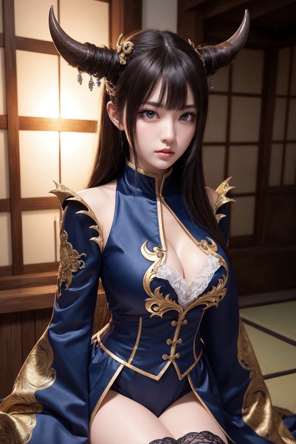 masterpiece, hyper detailed, 8K, hyper detailed illustration, Japanese woman, 23yo, (cute:1.1), (pretty:1.1), hyper detailed face, hyper detailed eye, beautiful eye, medium hair,(bangs:1.1), thin, tall,170cm tall, demon girl costume, kneehighs, hyper detailed, extremely detailed,