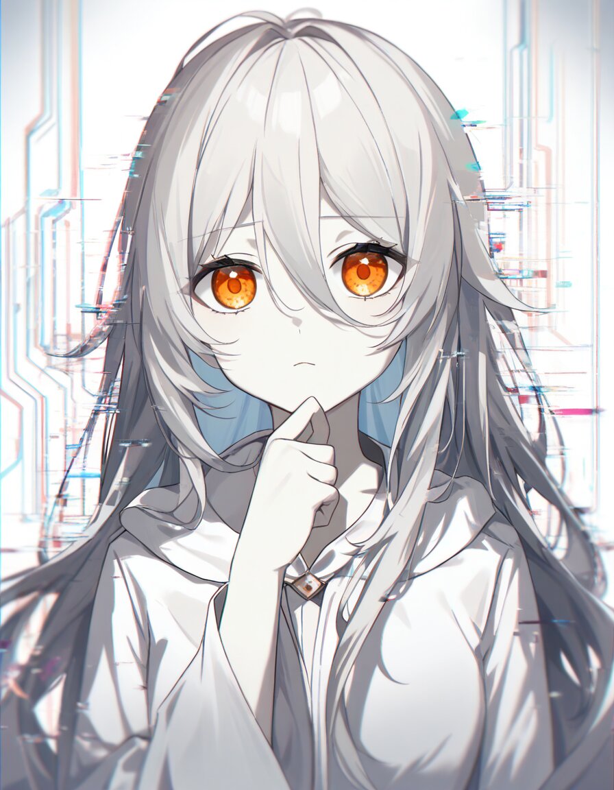 masterpiece, best quality, high quality, absurdres, circuit board background, blurry, 1girl, solo, ghost girl, silver hair, long hair, pale skin, orange eyes, thinking, robe, white robe, looking at viewer, glitch