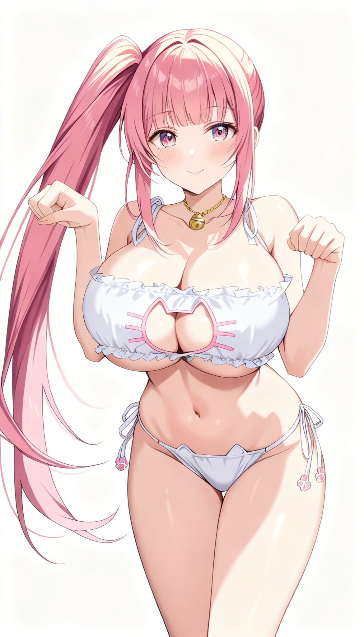 [masterpiece]++, [best quality]++, [ultra detailed]++, [hires]++, [8K]++, cat lingerie, cat ear panties, [paw pose]++, [standing]++,high side ponytail, 1girl, solo, [Beautiful Girl]++, [Beautiful face]++, [Symmetry face]++, [huge breasts]++, perky breasts, hanging breasts, curvy, cleavage, collarbone, gold necklace, bare legs, [tall]++, long hair, [straight hair]++, [shiny skin]++, [Soft lighting]++, [Cinematic lighting]++, cowboy shot, white background, smile, blush, closed mouth,