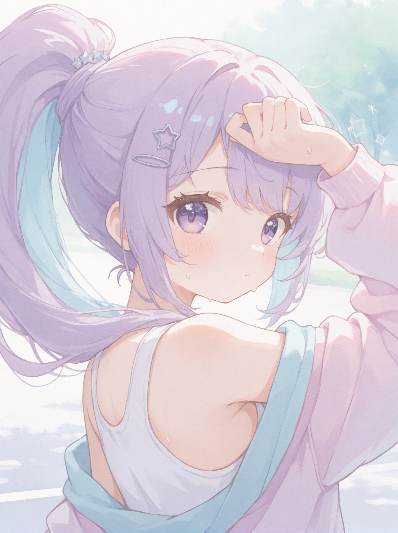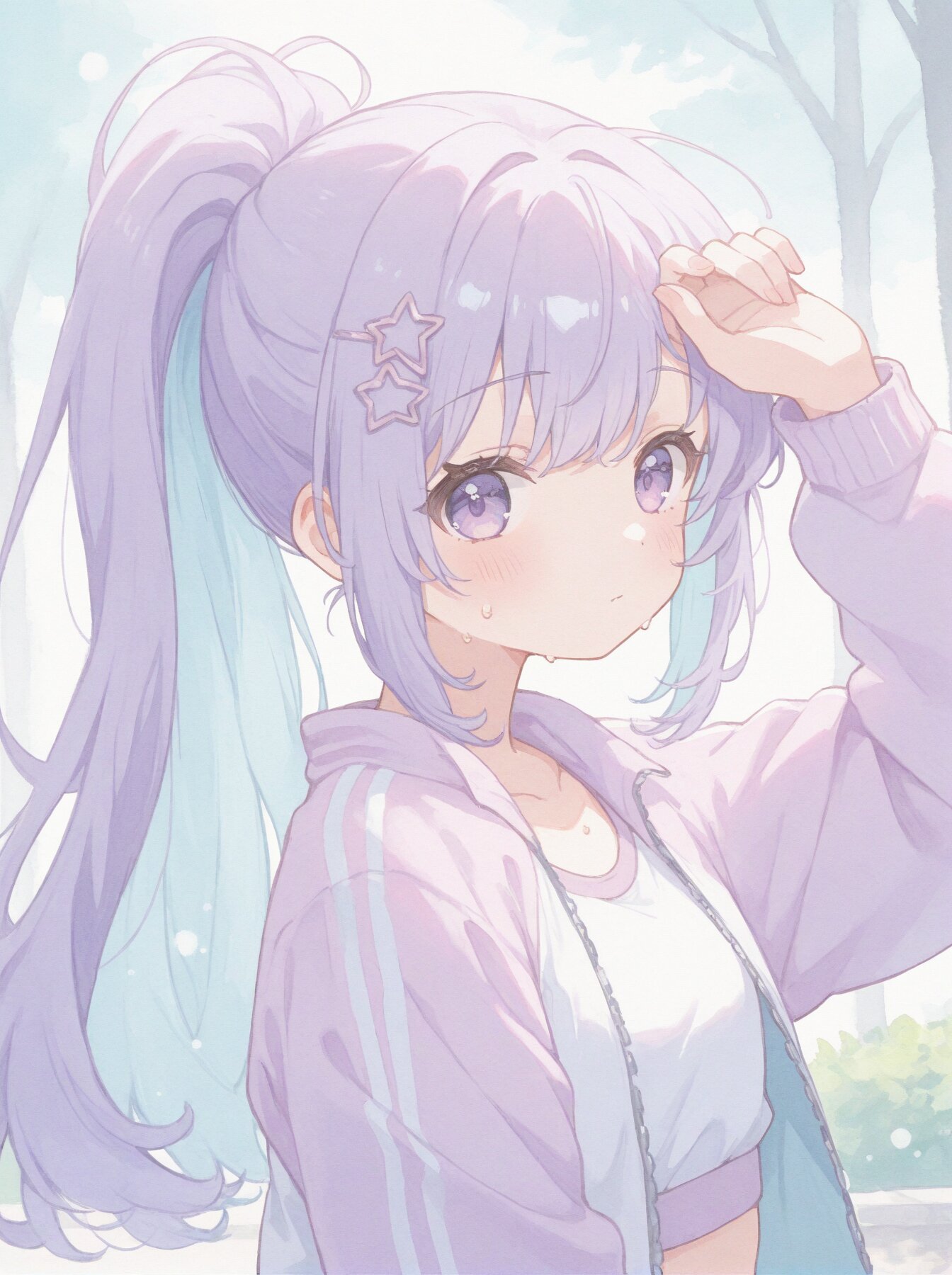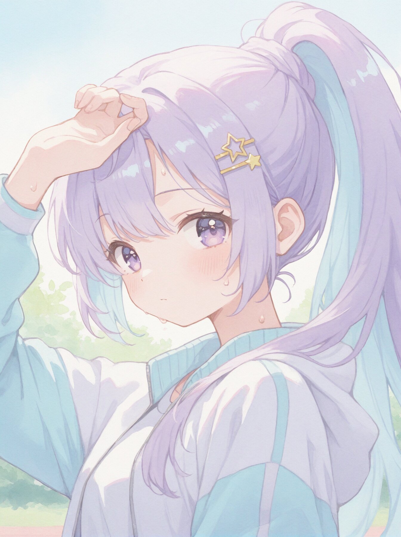 masterpiece, best quality, amazing quality, solo, kawaii, cute, (soft focus:1.4), (dreamy atmosphere:1.3), (soft pastel color palette:1.5), (pale colors:1.3), watercolor texture, matte finish, 1girl, (upper body:1.4), (close-up:1.3), looking back at viewer over shoulder, energetic wink, wiping sweat from forehead with back of hand, pastel purple hair, (light blue inner hair:1.3), energetic high ponytail, star-shaped hairpin, (bright purple eyes:1.4), wearing pastel colored sportswear, light pink running jacket, white sports top, bright outdoor park, soft sunlight, sparkling background, (watercolor style:1.6),, (soft pastel color palette:1.5), (pale colors:1.3), watercolor texture, matte finish, subtle shading, minimal contrast,