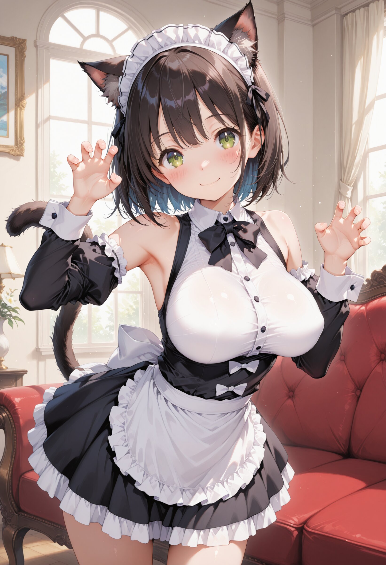 masterpiece, best quality, highres, ultra-detailed, extremely detailed, detailed, 1girl, , loli, petite, cat girl, cat ears, cat tail, , white maid uniform, black sleeves, bare shoulders, white waist apron, black ruffle skirt, slim legs, large breasts, impossible clothes, perky breasts, blush, in mansion living room, claw pose, dynamic pose, fantastic world, look at viewer, smile, cowboy shot,