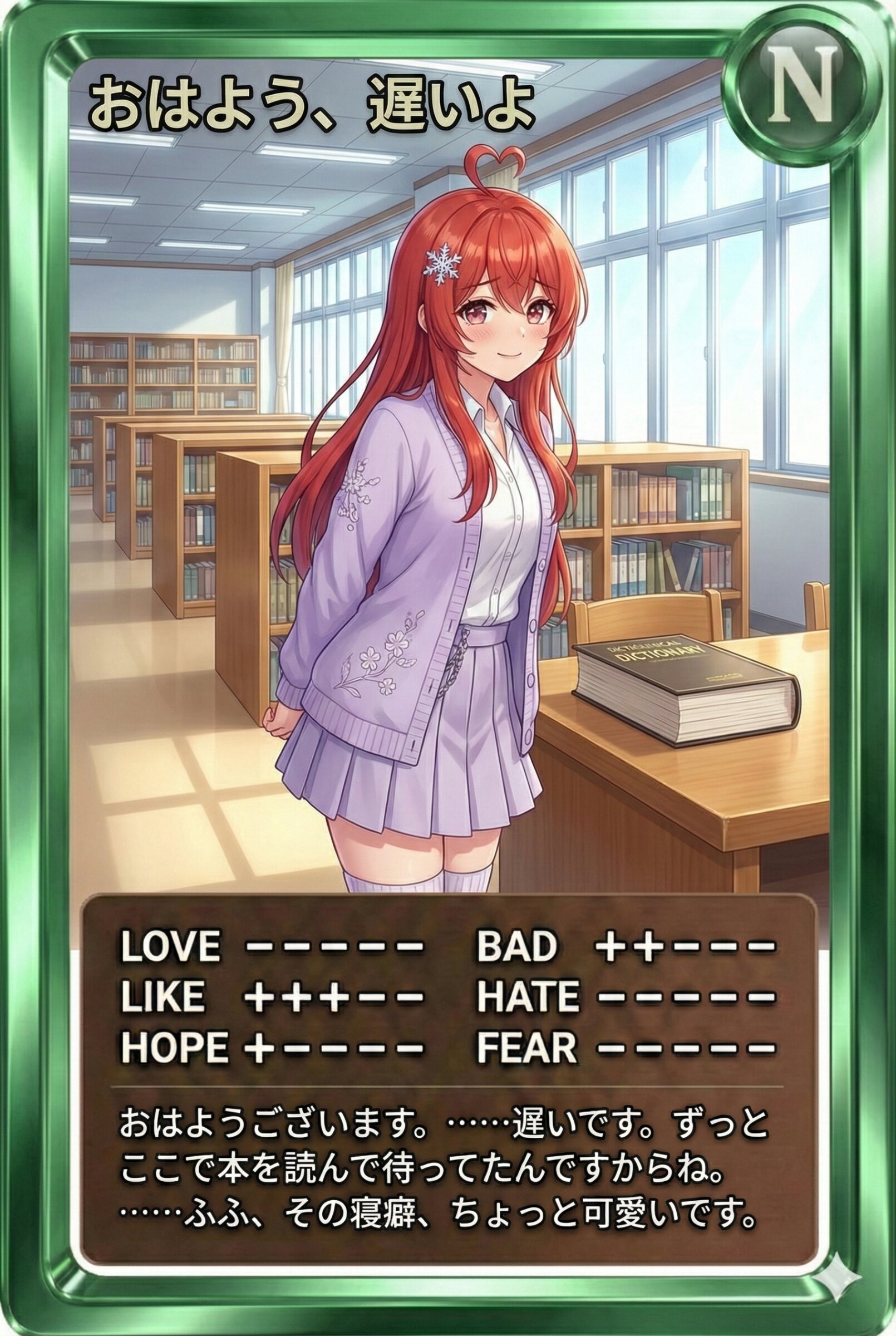 おはようございます。……遅いです。ずっとここで本を読んで待ってたんですからね。……ふふ、その寝癖、ちょっと可愛いです。