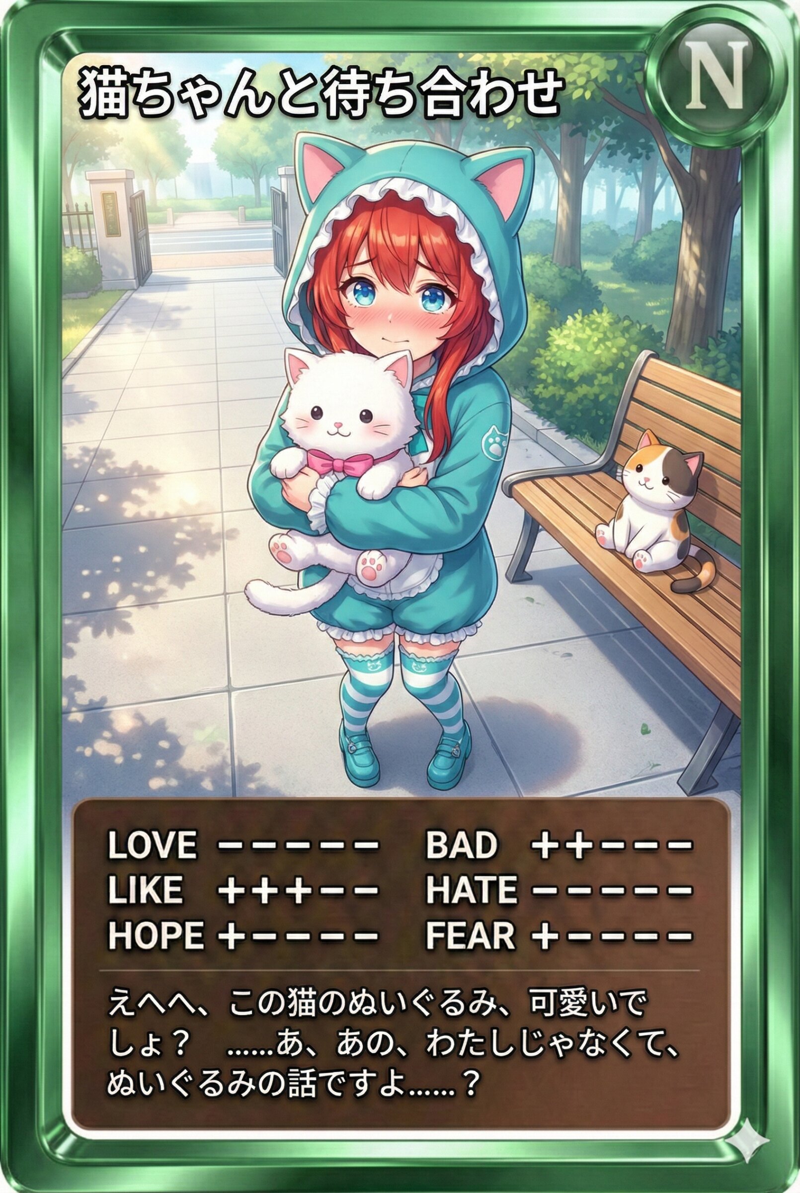 えへへ、この猫のぬいぐるみ、可愛いでしょ? ……あ、あの、わたしじゃなくて、ぬいぐるみの話ですよ……?