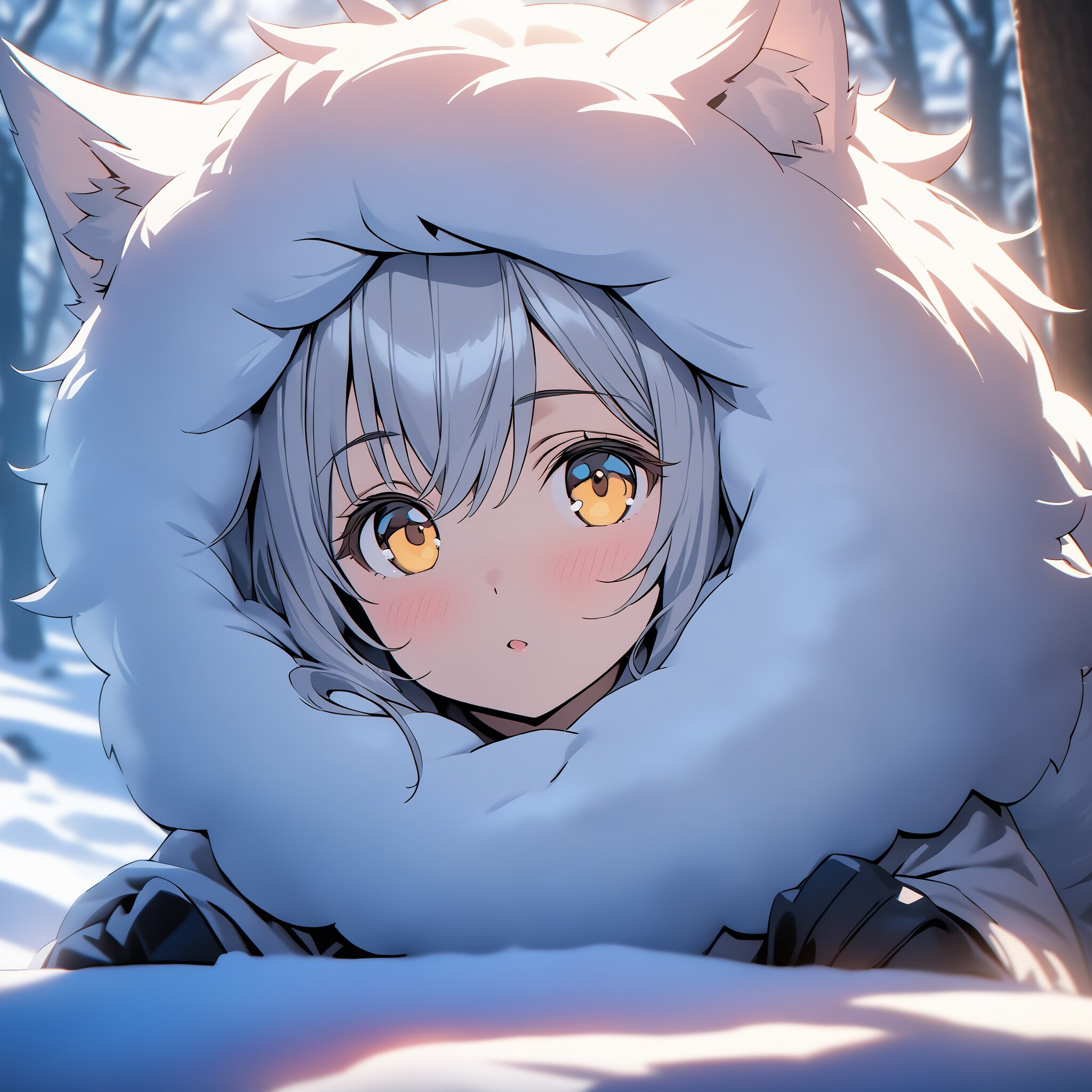 masterpiece, best quality, photorealistic, sharp focus, cinematic lighting, depth of field, beautiful composition, vibrant colors, ultra high res, 8K, highly detailed, masterpiece, best quality, very detailed, Extreme close-up, a cute anime wolf girl peeking through her own giant fluffy white tail, the tail frames her face like a soft cloud, golden eyes looking at the viewer, focus on the soft fur texture in foreground, snowy forest background, soft cinematic lighting, masterpiece, high quality.