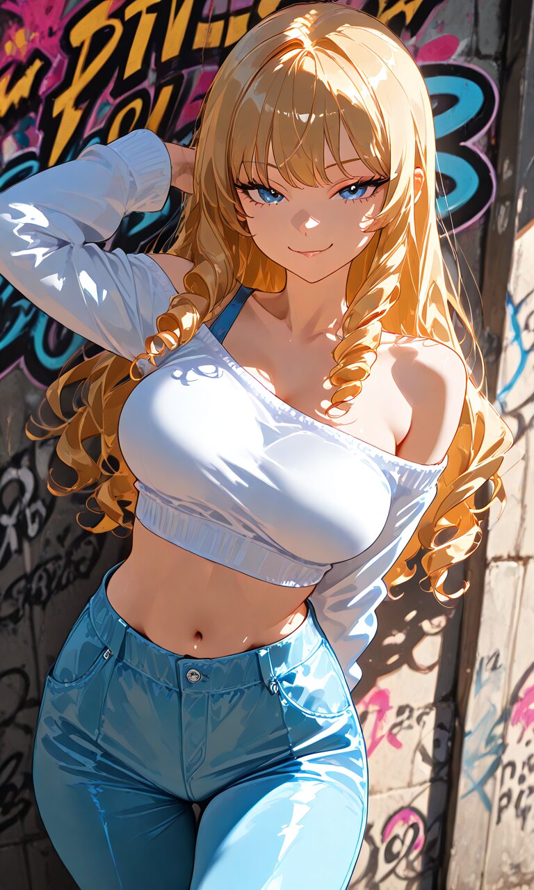 (best quality),(masterpiece),(ultra detailed),1 lady, long hair, drill hair, spiral curls, blonde hair, smugness, big breasts, wall, graffiti, 1girl, masterpiece, high detail eyes, k_pop model costumes, half-off-the-shoulder sweatshirt, crop top, pants, navel, full lashes, dark lashes,