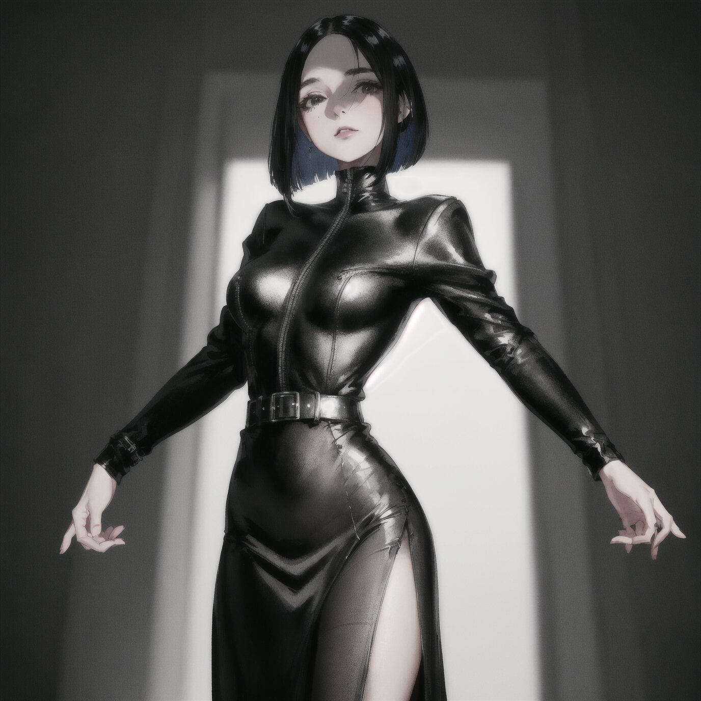 1girl, (8k:1.2100000000000002), (ultra high res:1.2100000000000002), (masterpiece:1.2:1.2100000000000002), (perfect anatomy:1.1:1.2100000000000002), (super detailed skin:1.2100000000000002), (textile shading:1.2100000000000002), standing, perfect face, (darkness:1.3:1.1), (office worker:1.2100000000000002), (black straight hair:1.2100000000000002), (jacket:1.2100000000000002), (high slit long skirt:1.2100000000000002), (pantyhose:1.2100000000000002), (pumps:1.2100000000000002), cinematic lightings, cinematic shadows, cinematic angle, cinematic pose, gorgeous illustration, perfect anatomy, official art illustration, high res, 16k, ultra detailed cg, upper body, detailed embroidery leather clothes, shiny clothes, glossy clothes, light smile, happy, from front, face focus, looking up at viewer, pale skin, mole, mole under eye, glossy parted lips, detailed black eyes, jet black hair, very short cut, blunt ends, forehead, center parted hair, no bangs, shiny hair, glossy hair, silky straight hair, detailed leather skirt, waist chain belt, high side slit, black jacket, she is wearing a long, flowing dress with intricate patterns and designs on it. the dress has a high neckline and long sleeves, and the skirt is made up of multiple layers of fabric with different colors and patterns. the overall style of the illustration is futuristic and edgy. (best quality:1.2100000000000002)