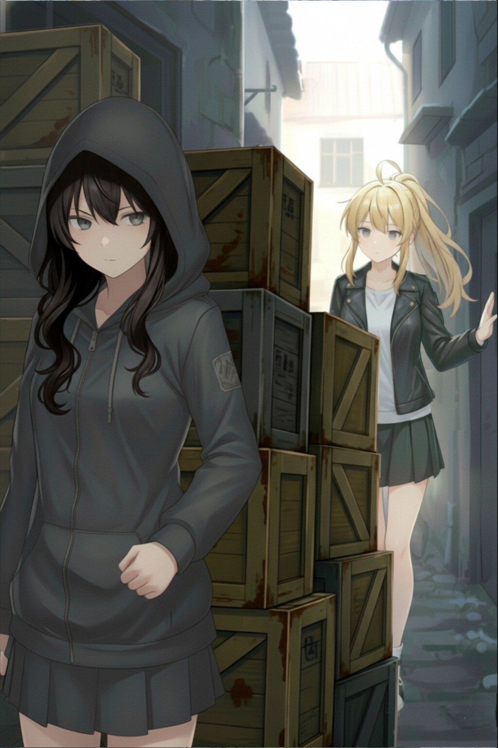 A digital anime illustration of two young women in an alleyway. The woman in the foreground is looking at the viewer. She has dark hair and is wearing a dark grey hoodie and a dark skirt. She is standing in front of a stack of wooden crates. The woman in the background is looking at the woman in the foreground. She has blonde hair and is wearing a black leather jacket and a black skirt. She is peeking from behind a stack of wooden crates. The alleyway has buildings on both sides. The art style is clean and smooth, with soft shading.
