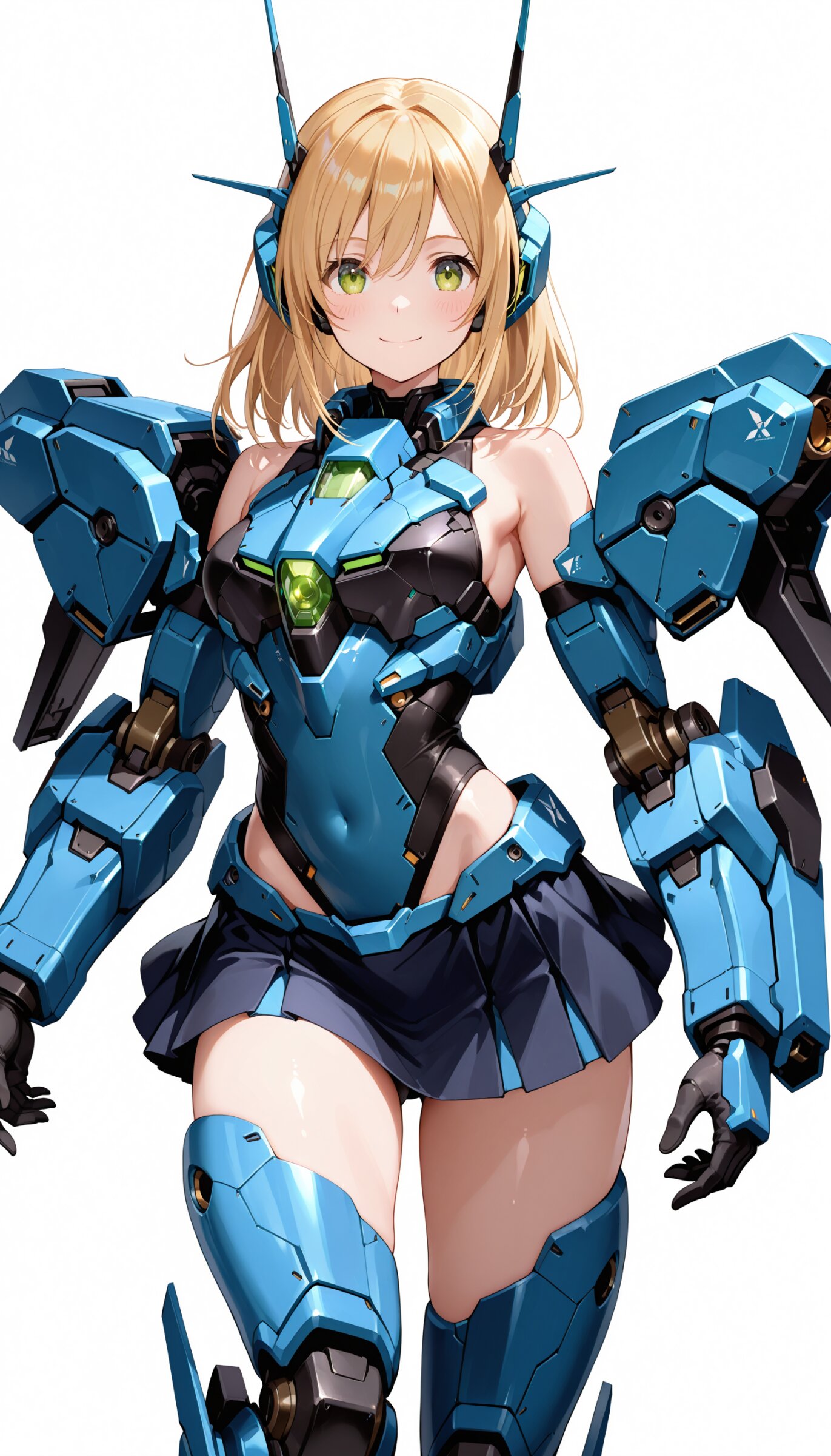 1girl, ((white background)), ultra detailed 8k cg render, masterpiece, high resolution, extremely detailed, mecha musume,mecha shoulder, mech leg, headgear, mecha armor, ((mini skirt)),long blonde hair, dropping green eyes, smile, dynamic posing,