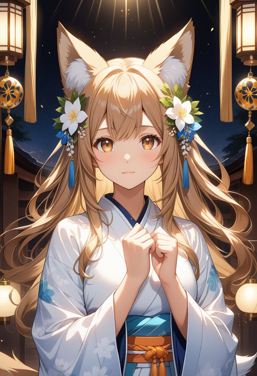 (high resolusion,illustration,ultra detailed 8k art,extremely detailed CG,official art,clothes reflecting light,detailed shiny skin,detailed background:1.3), ((highly detailed beautiful face and eyes),anime_style, fox_ears, girl, light_brown_hair, double_eyelids, long_eyelashes, fluffy_tail, shiromuku, tsunokakushi, soft_lighting, elegant_pose, traditional_japanese_style, serene_atmosphere