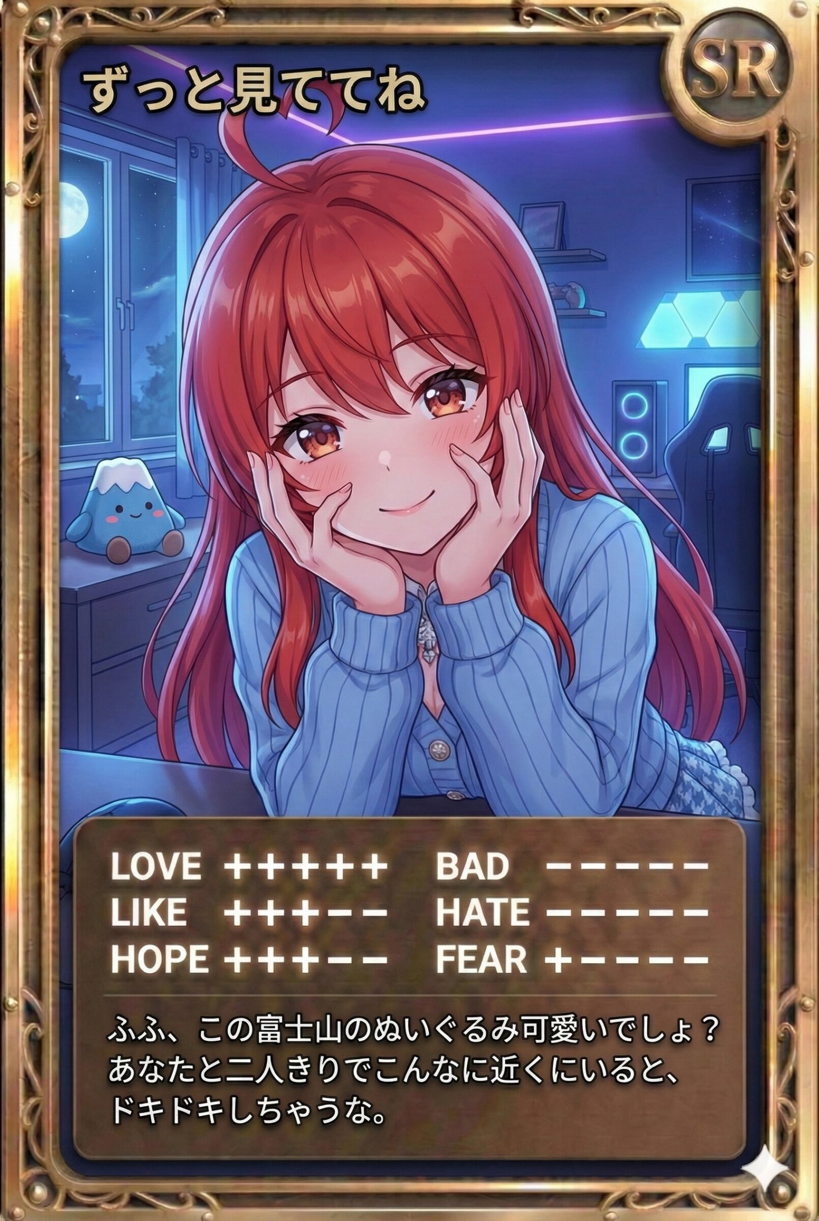 ふふ、この富士山のぬいぐるみ可愛いでしょう?あなたと二人きりでこんなに近くにいると、ドキドキしちゃうな。