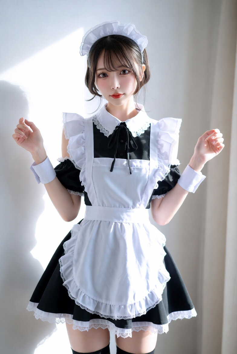 A hyper-detailed photograph of a young Japanese woman in a maid costume, posing against a plain background.