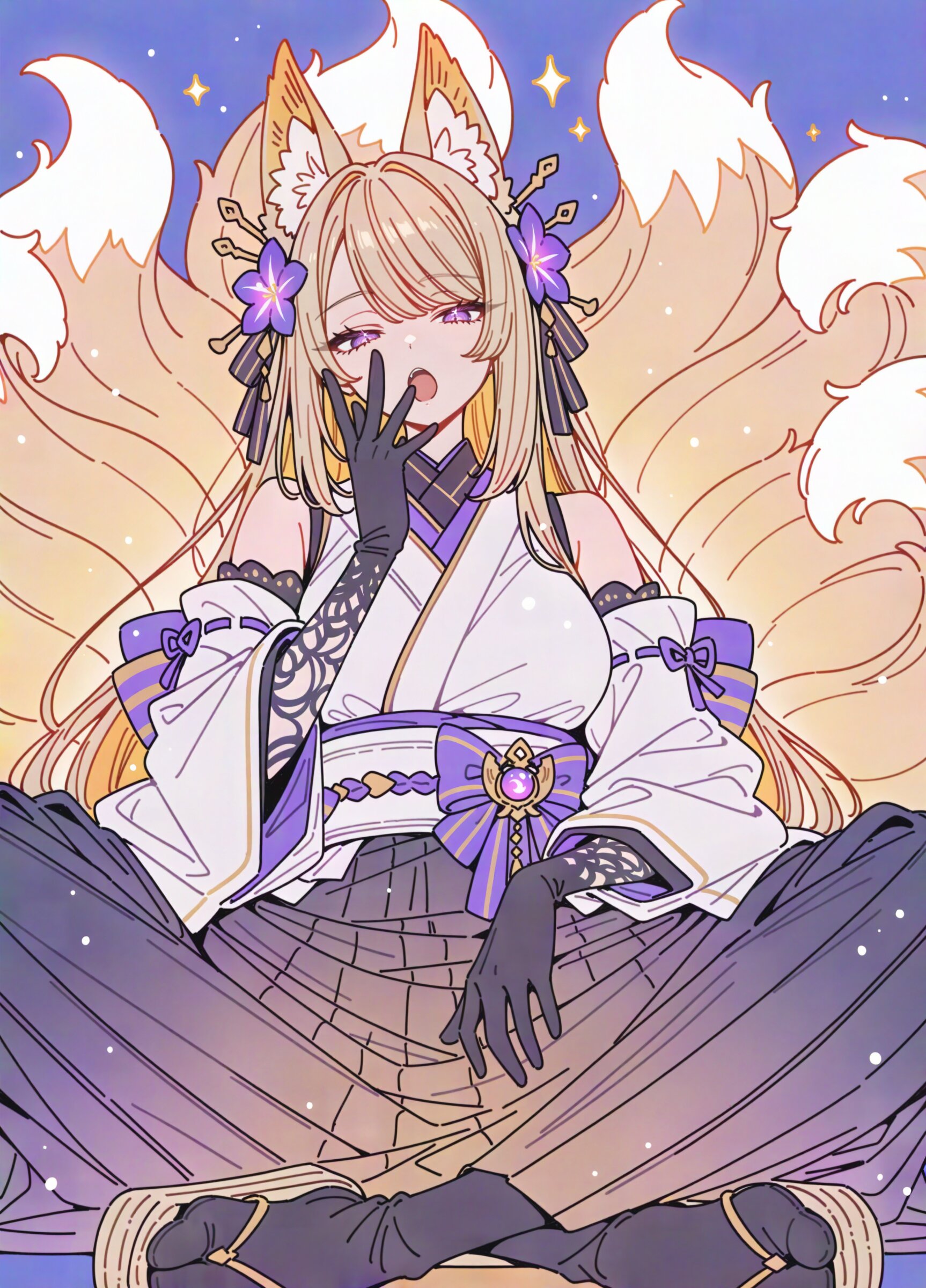 front view, (low angle shot:1.2), (close up:1.2), dynamic angle, looking at viewer, (simple pastel color background:1.1), drop shadow, colored shadow, The background is a solid, bright warm colored ultramarine, creating a striking contrast with the intricate, multi-colored design of the character, (ink wash effect:0.9), pop color background, (high saturation:1.2), winter coloring, winter atmosphere, 1girl, fox girl, gold Blond Hair, large breasts and fox ears, (swept bangs:1.2), (perfect purple eyes:1.3) long eyelashes aristocratic features tall girl has (Blond Hair long hair over ears:1.3) fox 9tails, (wearing White Japanese Cloth straw sandal black silk gloves long skirt Obi boots:1.3), hair ornament flower, tabi, winter scarf, (fur trim:1.1), black thighhighs, detached sleeves, mysterious atmosphere, seductive smile, bored, sleepy, yawning, sitting, indian style, warm colored ultramarine theme, super fine concept art, 8K, graceful eyes, masterpiece, best quality, amazing quality, very aesthetic, absurdres, newest, professional art lots of details, , overexposure, sumie effect style, 4ur4_illu,shiny, glowing, glowing particles, glowing light particles, light particles, sparkle , <lora:noline (1):-0.5> <lora:sdxl2-flat2-512b:-0.2> <lora:facelightup_xl_v10:0.5> <lora:V2_yakumo_alchemy:0.5> <lora:Aura_illu:0.1>