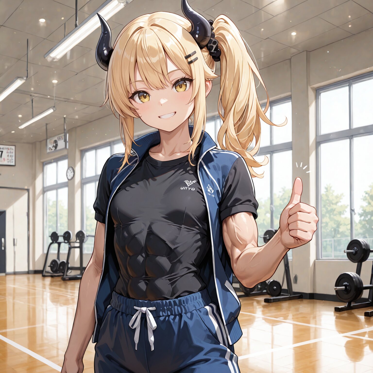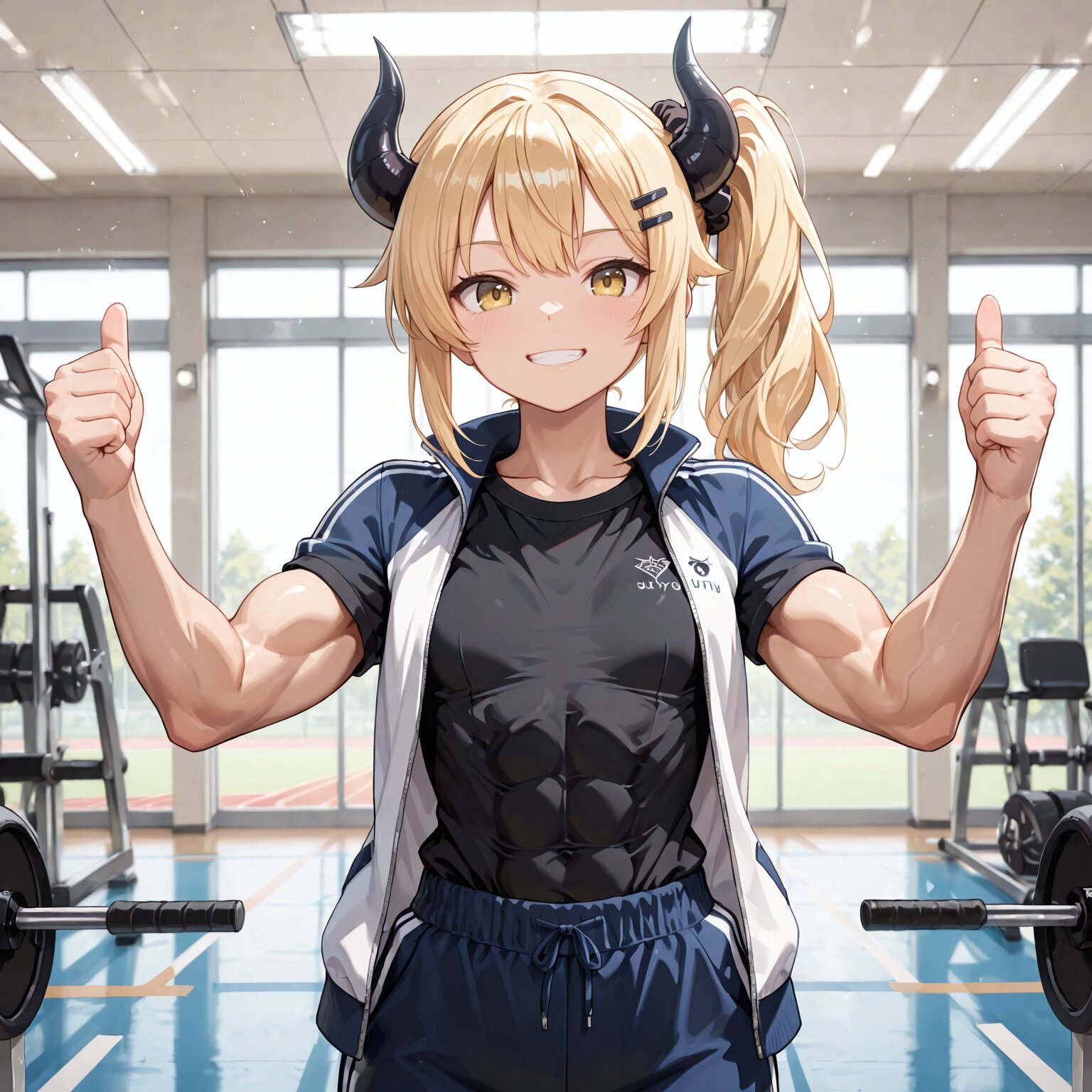 masterpiece,best quality,highres,ultra detailed,highly detailed,8k,general,1girl,solo,17yo,cute,(muscular female,muscular,toned female,toned arms,defined muscular arms,covered abs:1.3),(two demon horns,black horns,side ponytail),small breasts,blonde hair,long hair,bangs,hair scrunchie, hairclip,yellow eyes,light smile,grin,demon girl,(track jacket,open jacket,short sleeves,black T-shirt,shirt tucked in,long track pants),slender girl,thumbs up,looking at viewer, front view, front view,in sports gym,indoors,
