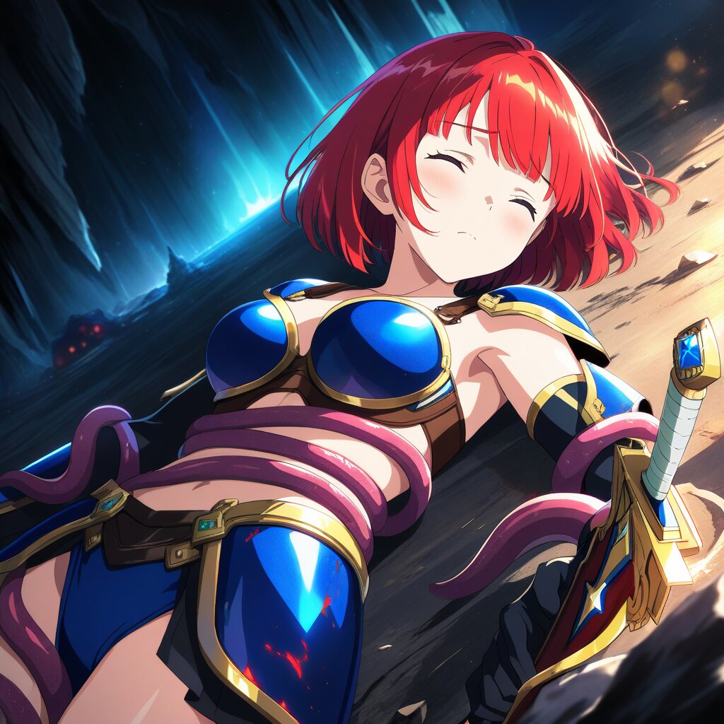 ((masterpiece)), ((best quality)), (ultra-detailed), anime style,cowboy shot, Dark underground cave, a cute girl, (blue bikini armor) ,large bust,Tentacles entangled her body, beautiful red hair, beautiful purple eyes, ((beautiful eyes)), short hair, bob cut, Holding a weapon in hand, gripping Sword, ((lie on back)) ,(((closed eyes))) , ((death)),Defeat scene,Painful Face