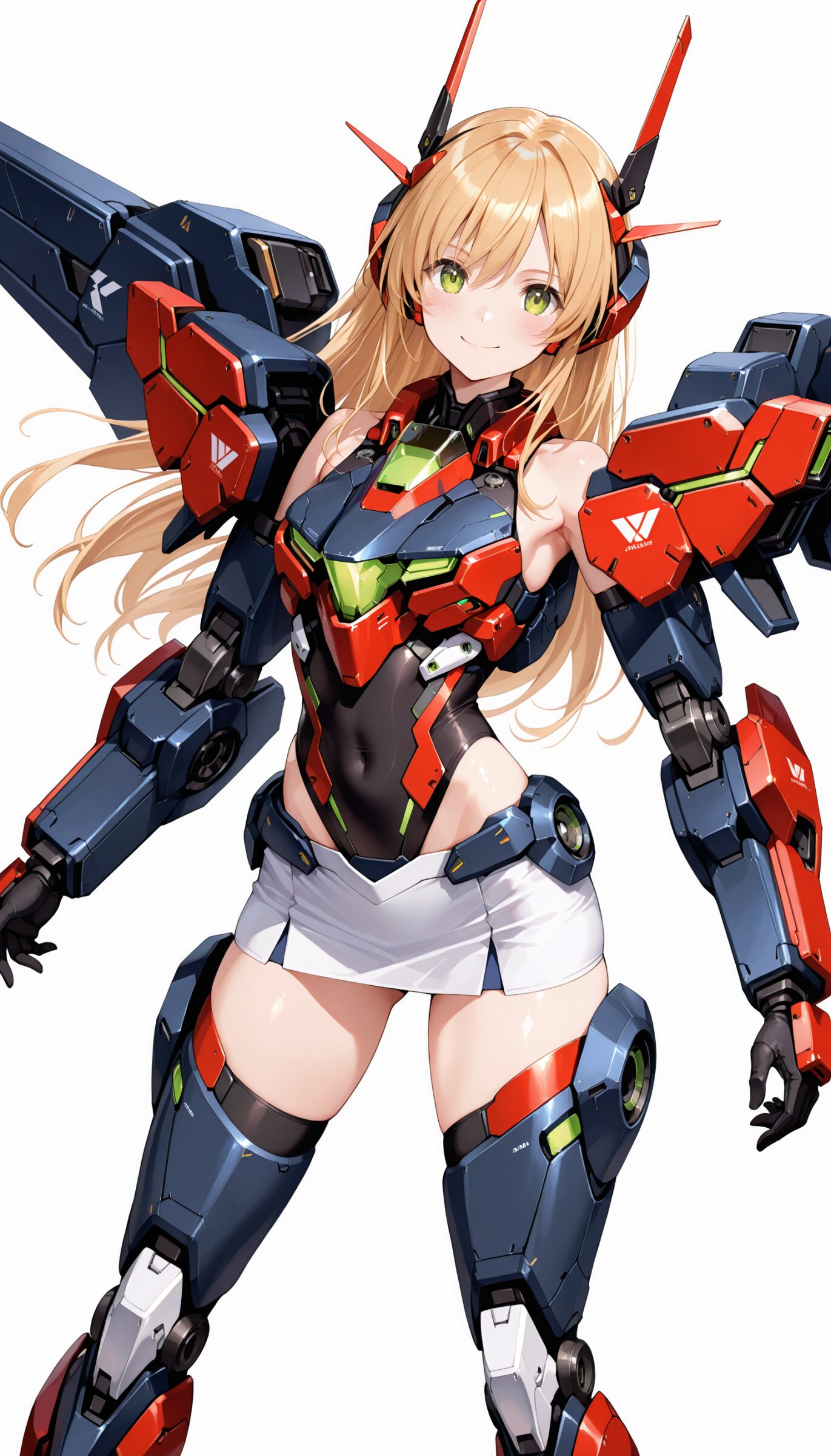 1girl, ((white background)), ultra detailed 8k cg render, masterpiece, high resolution, extremely detailed, mecha musume,mecha shoulder, mech leg, headgear, mecha armor, ((mini skirt)),long blonde hair, dropping green eyes, smile, dynamic posing,