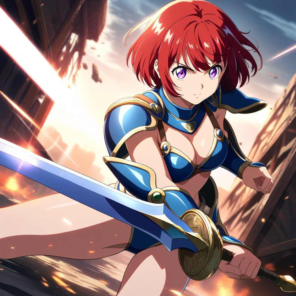 ((masterpiece)), ((best quality)), (ultra-detailed), anime style,cowboy shot, inside dilapidated building,Jumping, a cute girl, (blue bikini armor) ,large bust, beautiful red hair, beautiful purple eyes, ((beautiful eyes)), short hair, bob cut, Holding a weapon in hand, gripping Sword, Epic Battle Scene,Serious,dynamic pose,dynamic angle