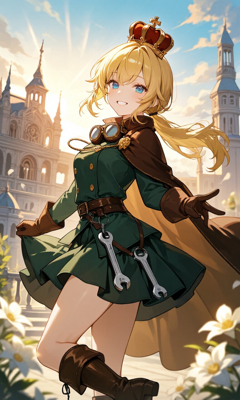 A 15-year-old girl with long blonde hair tied in a low ponytail and bright blue eyes looks directly at the viewer with a cheerful grin, revealing slightly visible teeth. She wears a (Dark green luxurious Prince costume:1.6) with long sleeves, paired with a (luxurious Dark green mini skirt:1.4) and (luxurious Brown Boots:1.3). A (luxurious Brown Cape:1.3) flows behind her, and she has a (luxurious crown on head:1.4) resting atop her delicate hair. Around her neck hangs a pair of goggles, and on her waist, (two polished chrome combination wrenches on a steel D-ring:1.3) dangle, suggesting a mechanical theme. She wears (luxurious Brown Gloves:1.3), completing her princely yet functional attire. The background features a grand palace with intricate mechanical architecture, bathed in warm afternoon sunlight. The blue sky is dotted with soft clouds, and sunbeams create a lens flare effect, enhancing the romantic, classic academia atmosphere. Flowers bloom around her, adding to the light and dreamy setting. The artwork is insanely detailed, with masterful rendering of her delicate face, flawless skin, flowing hair, and luxurious clothing, achieving a 16K masterpiece quality. Her pose is dynamic and cute, exuding charm and confidence as Prince Charming.