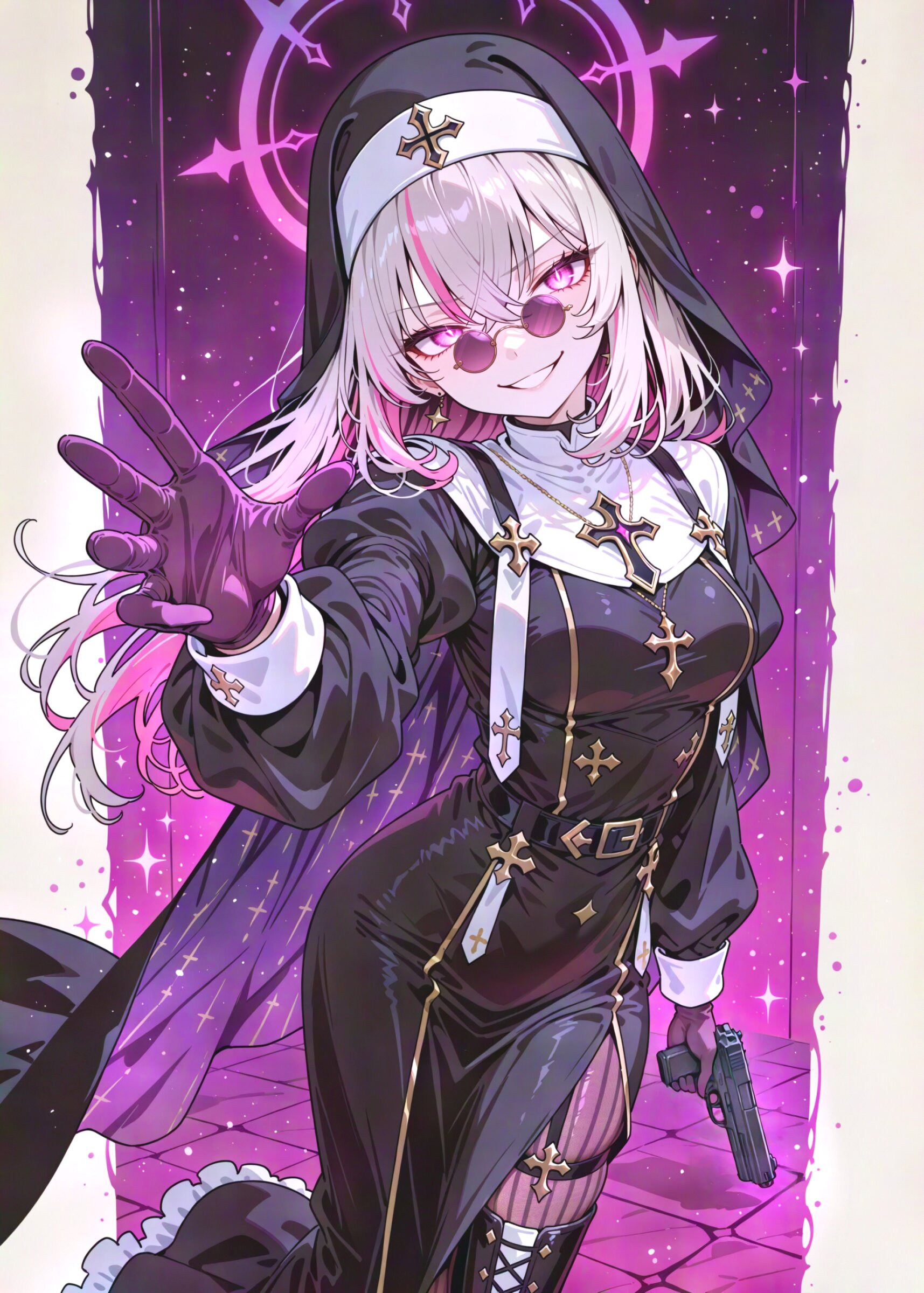 from front close to viewer from above, looking up , looking at viewer, (simple watercolor background:1.1), drop shadow, colored shadow, 1girl, nun, beautiful detailed eyes, holy face, cool Elegant and sophisticated demeanor, (pale skin:1.0), skindentation, beautiful magenta eyes, pince-nez , slategray hair, black streaked hair, highlights hair, shoulder length hair, Curl outward hair crossed bangs , floating hair, first-rate female bodies perfect body beautiful medium breasts wide hips, , solo, nun, Good texture priest's hat, white laced cape, , black religious Stola, long sleeves, the feel of silky, , , , white laced gloves, , long skirt, frilled skirt, vertical-striped pantyhose, thigh boots, shiny smile, (evil grin:1.2), outstretched arm , holding gun, super fine concept art, hard surface, 8K, masterpiece, best quality, amazing quality, very aesthetic, absurdres, professional art lots of details, , overexposure, shiny-glistening, (watercolor style:0.0), (pastel color style:0.0) 4ur4_illu,shiny, glowing, glowing particles, glowing light particles, light particles, <lora:noline (1):1.0> <lora:sdxl2-flat2-512b:0.2> <lora:facelightup_xl_v10:0.5> <lora:V2_yakumo_alchemy:0.5> <lora:Aura_illu:0.1>
