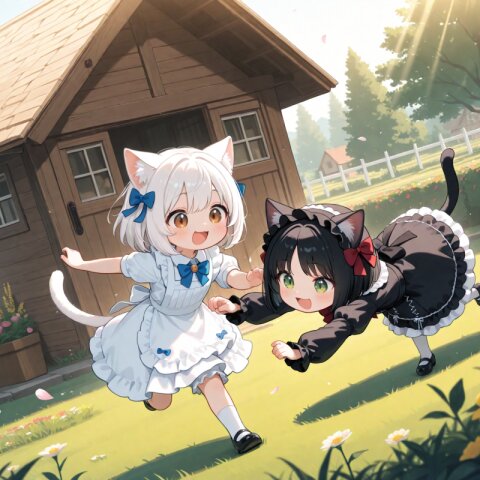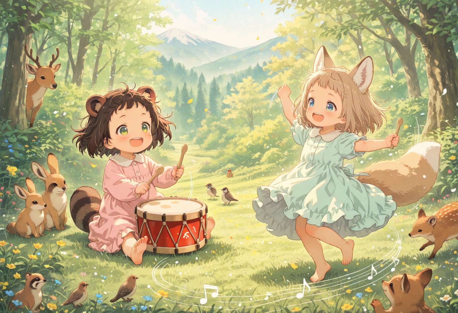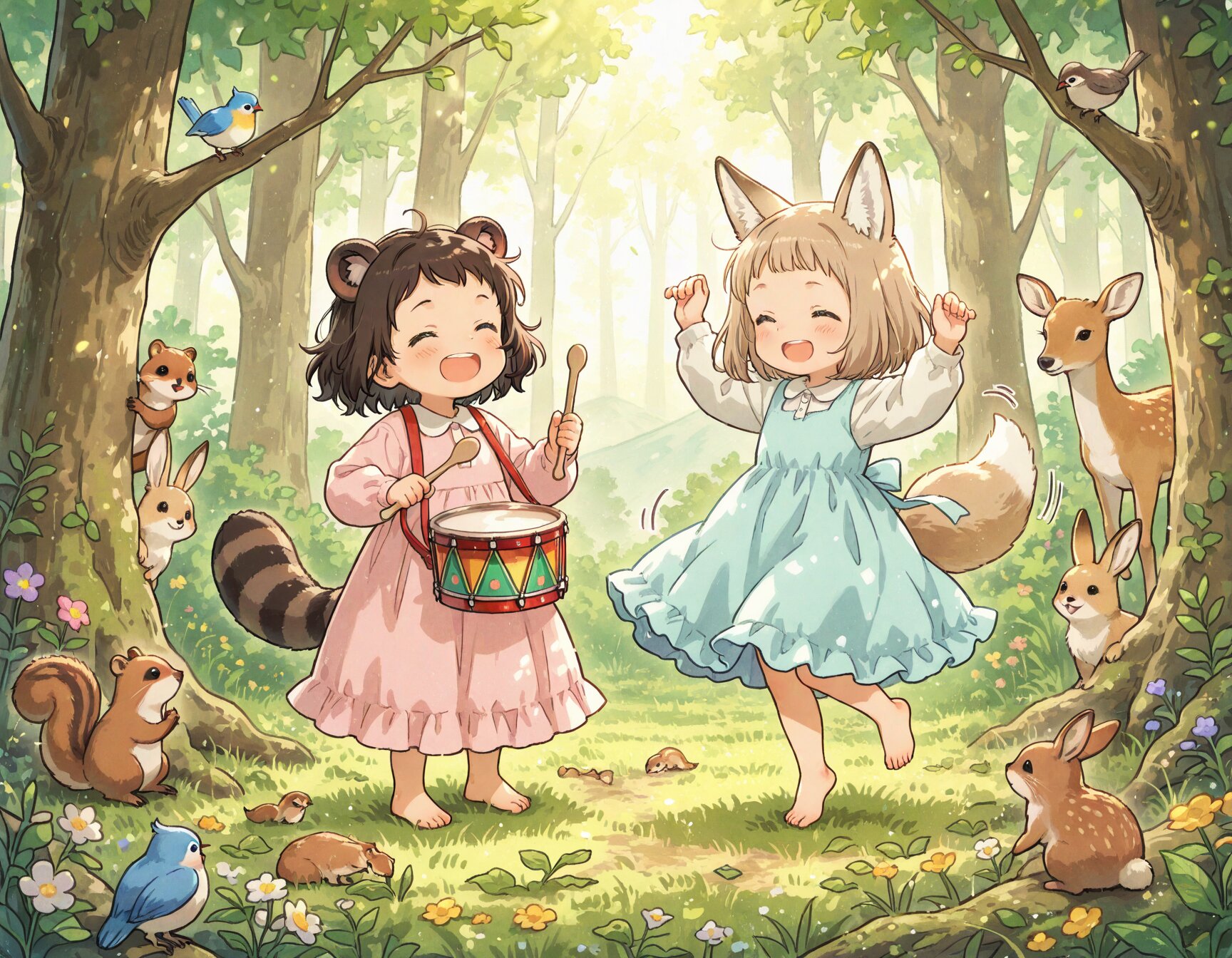 2girls, loli, mid, general, traditional media, picturebook-style, (colored pencil texture), pastel colors, soft tone, no lineart, no outline, (drawing lines, Paper texture), ultra-detailed background, Very detailed costumes, (barasui:0.1), (oyari ashito:0.1), (masterpiece, best quality, amazing quality, very aesthetic, high resolution, ultra-detailed, absurdres,), dynamic angle, dynamic composition, dynamic pose, upper body, gentle lighting, warm pastel colors, soft shading, wholesome atmosphere, mountain forest clearing, green meadow surrounded by trees, soft sunlight filtering through leaves, wildflowers in grass, peaceful mountain background, small woodland animals watching from bushes, curious rabbits, squirrels, birds on branches, deer peeking from trees, gentle expressions, rhythmic motion, dynamic but cute movement, forest animals gathering around, magical warm feeling, BREAK loli, dark brown hair, short hair, messy hair, short bangs, green eyes, tareme, (dark brown raccoon ears, fluffy raccoon tail with stripes), wearing simple soft-colored dress, sitting and happily beating small toy taiko drum, wooden small taiko drum, joyful expression, energetic movement, taiko drum, (holding taiko drumsticks), laughing, happy, BREAK loli, light brown hair, medium hair, choppy bangs, blue eyes, (light brown fox ears, Light brown fox tail with white tip, petite), light pastel dress, spinning and dancing happily, arms lifted, skirt fluttering, smiling brightly, (dancing:1.1), happy smile,