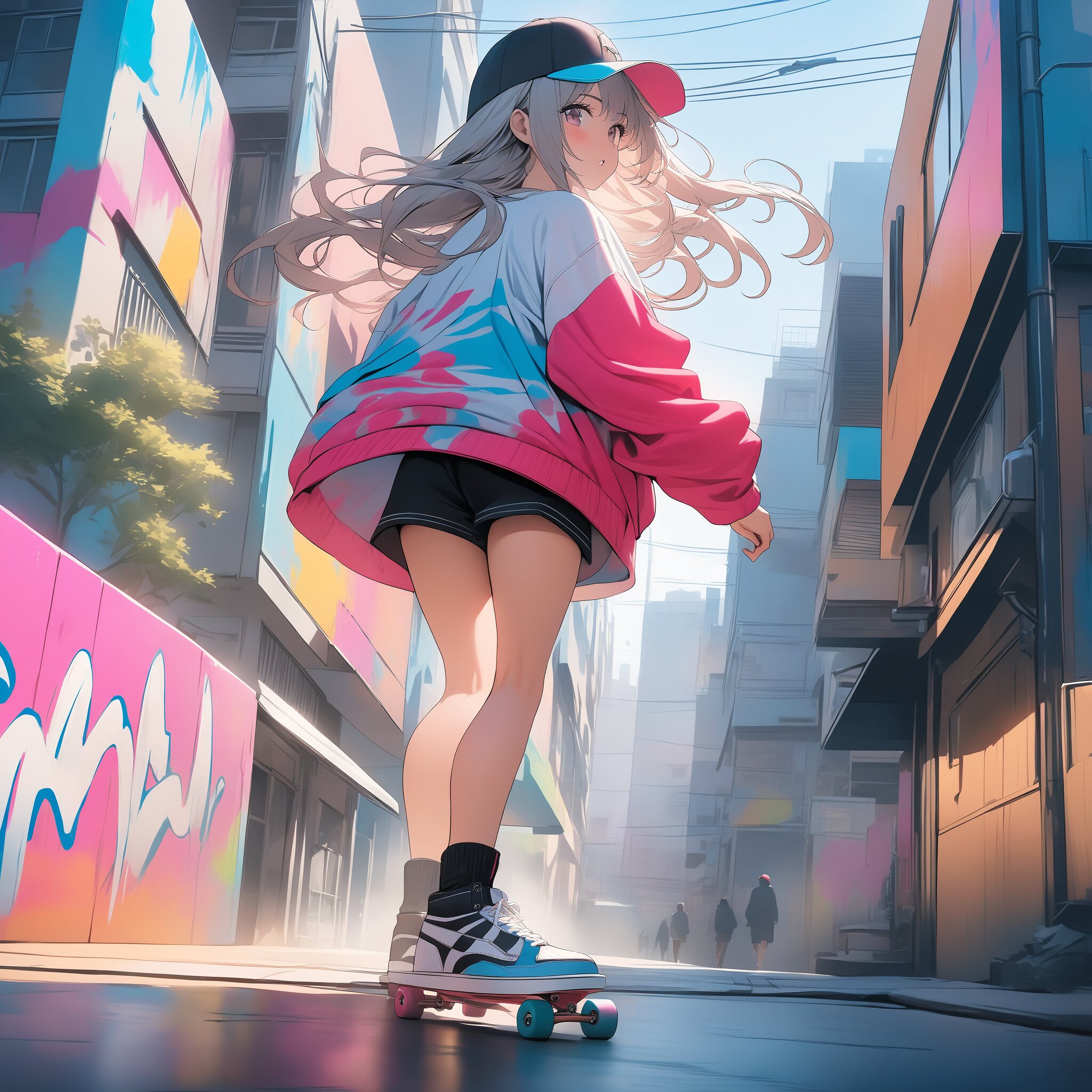 masterpiece, best quality, photorealistic, sharp focus, cinematic lighting, depth of field, beautiful composition, vibrant colors, ultra high res, 8K, highly detailed, masterpiece, best quality, very detailed, Wide-angle street shot, a cute anime girl riding a skateboard with confidence, urban city background with colorful graffiti, wearing an oversized jersey and a baseball cap, one leg pushing off the ground, hair flowing in the wind, dynamic tilted composition, vibrant street colors, detailed sneakers, stylish and cool.